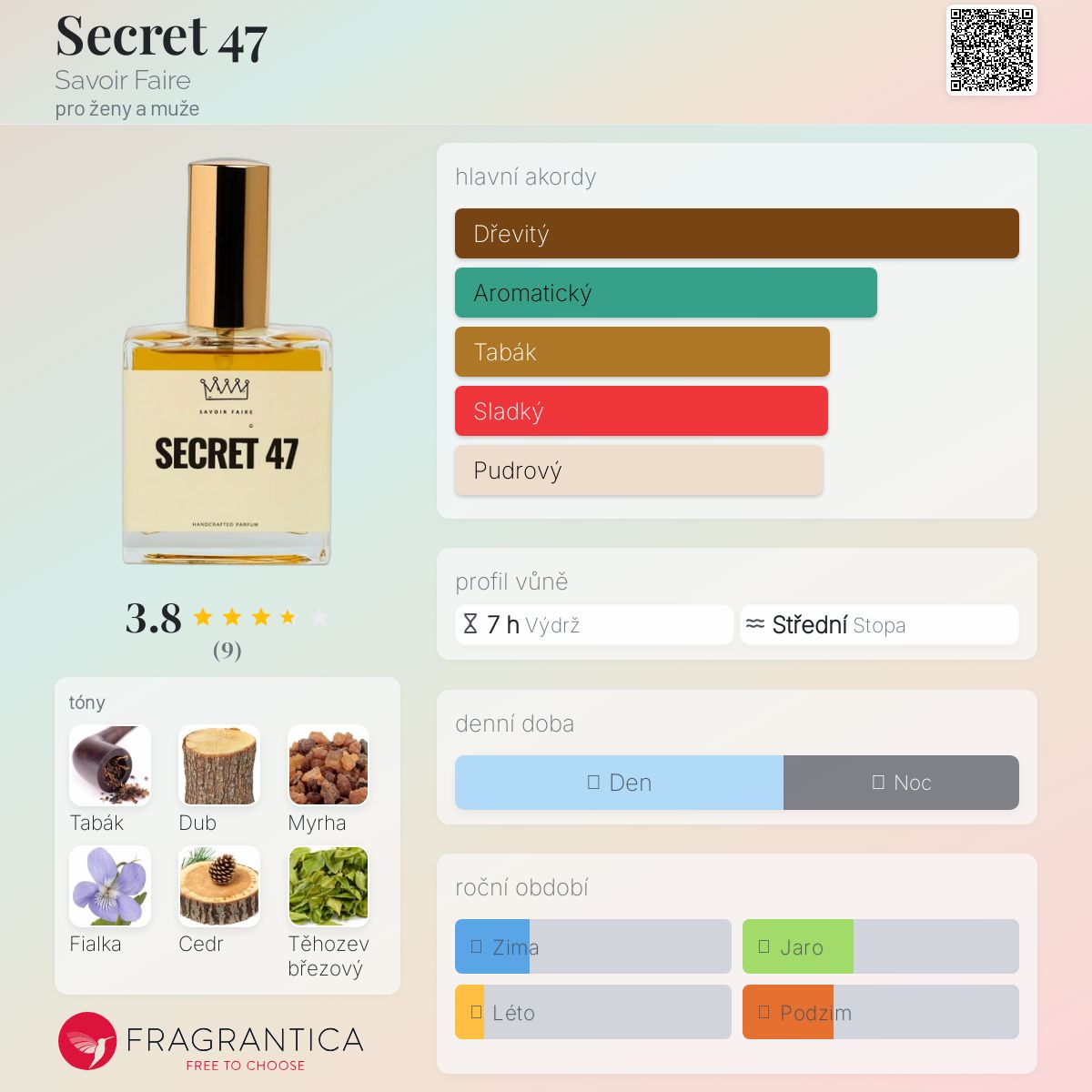 Secret 47 podle Savoir Faire je Woody Aromatic vůně pro ženy a muže. Secret 47 byl/a uveden/a v roce 2023. "Nosem" za touto vůní je Chris Classic.