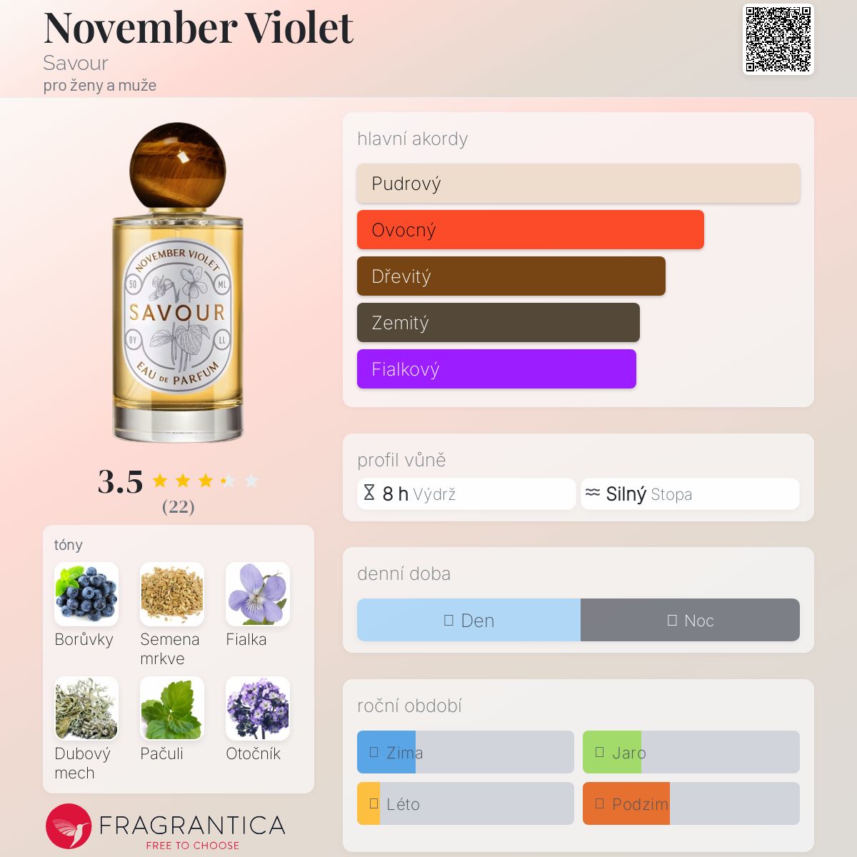 November Violet podle Savour je Chypre vůně pro ženy a muže. November Violet byl/a uveden/a v roce 2021. "Nosem" za touto vůní je Linda Landenberg.