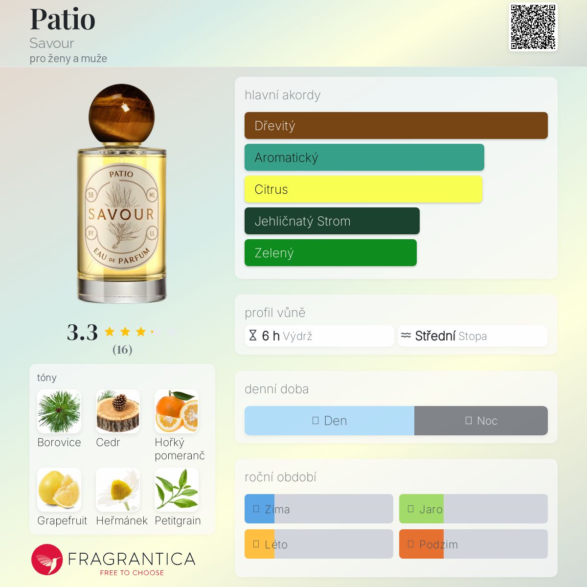 Patio podle Savour je Citrus Aromatic vůně pro ženy a muže. Patio byl/a uveden/a v roce 2021. "Nosem" za touto vůní je Linda Landenberg.