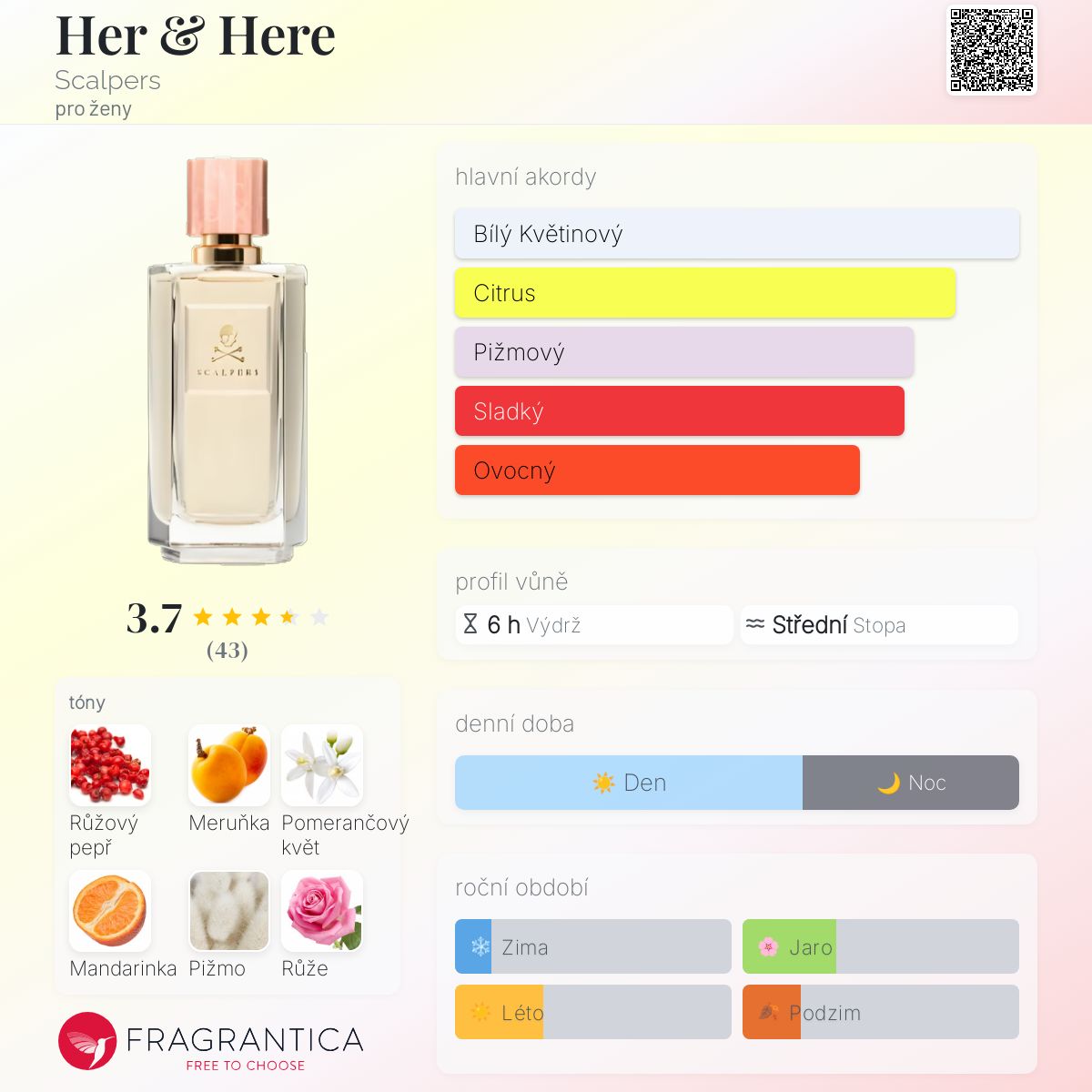 Her & Here podle Scalpers je Chypre Floral vůně pro ženy. Her & Here byl/a uveden/a v roce 2023. Her & Here byl/a vytvořen/a Delphine Lebeau a Jean-Christophe Hérault. Vrchní tóny jsou Růžový pepř, Mandarinka a Růže; střední tóny jsouMeruňka, Pomerančový květ, Růže a Jasmín ; základní tóny jsou Pižmo, Peruánský balzám, Pačuli a Vetiver.