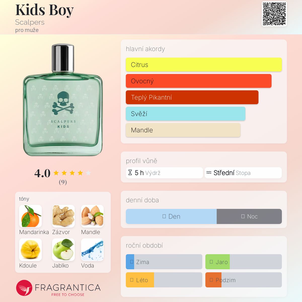Kids Boy podle Scalpers je Aromatic Fruity vůně pro muže. Vrchní tóny jsou Mandarinka, Kdoule a Jablko; střední tóny jsouZázvor, Mandle a Vodní tóny ; základní tóny jsou Vanilka, Cedr a Pižmo.