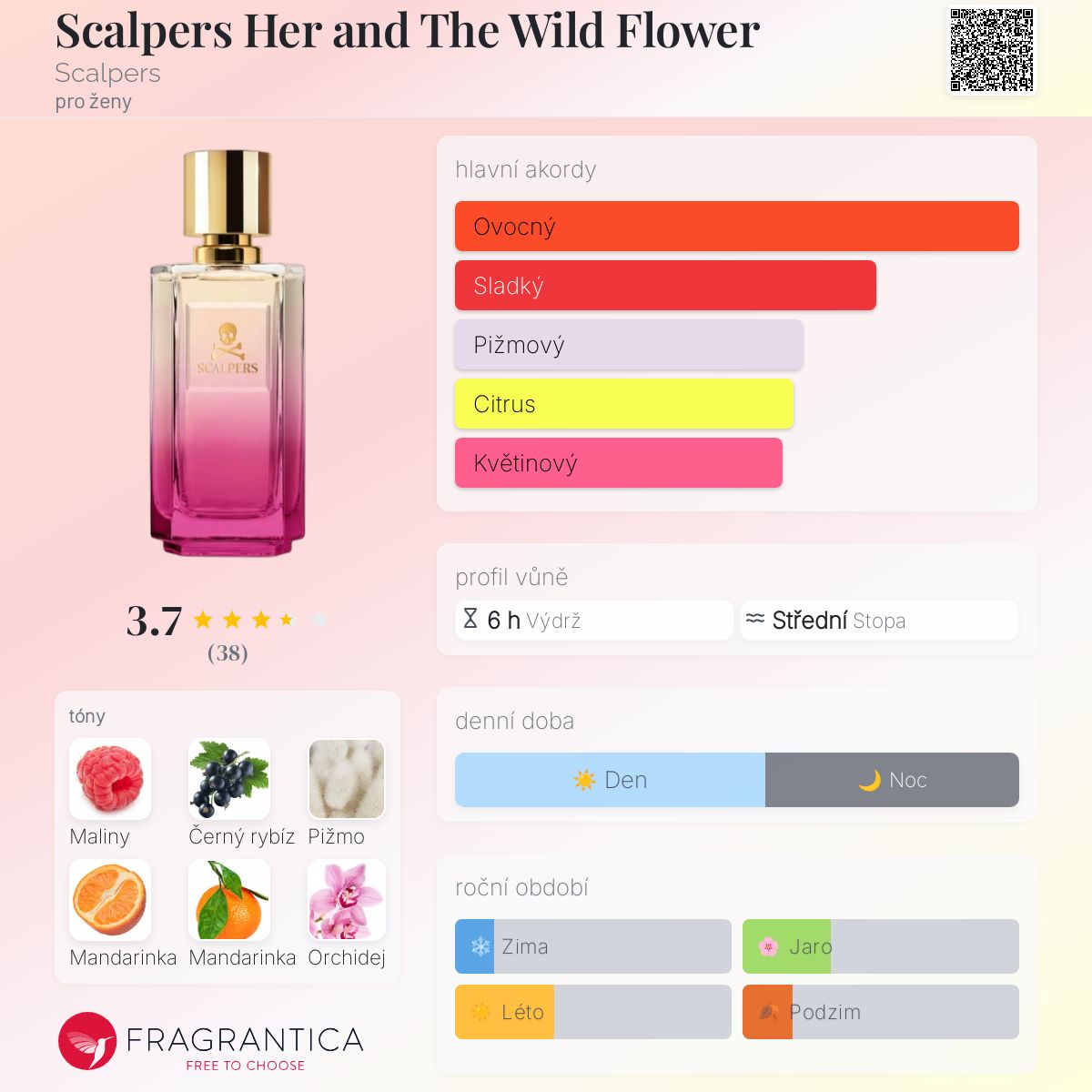 Scalpers Her and The Wild Flower podle Scalpers je Floral Fruity vůně pro ženy. Toto je nová vůně. Scalpers Her and The Wild Flower byl/a uveden/a v roce 2024. Scalpers Her and The Wild Flower byl/a vytvořen/a Domitille Michalon Bertier a Caroline Dumur. Vrchní tóny jsou Maliny, Černý rybíz a Mandarinka a Mandarinka; střední tóny jsouOrchidej, Divoká růže a Jiřina ; základní tóny jsou Pižmo, Ambroxan, Karamel a Mech.