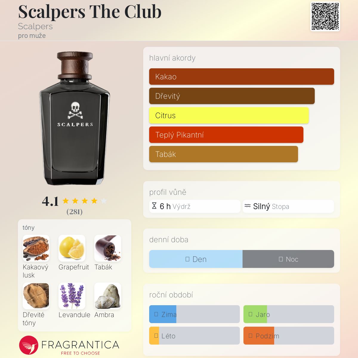 Scalpers The Club podle Scalpers je Woody Aromatic vůně pro muže. Scalpers The Club byl/a uveden/a v roce 2021. Scalpers The Club byl/a vytvořen/a Ane Ayo a Clement Gavarry. Vrchní tóny jsou Kakao, Grapefruit a Šalvěj; střední tóny jsouTabák, Levandule a Zázvor ; základní tóny jsou Dřevité tóny, Ambra, Pačuli a Vetiver.