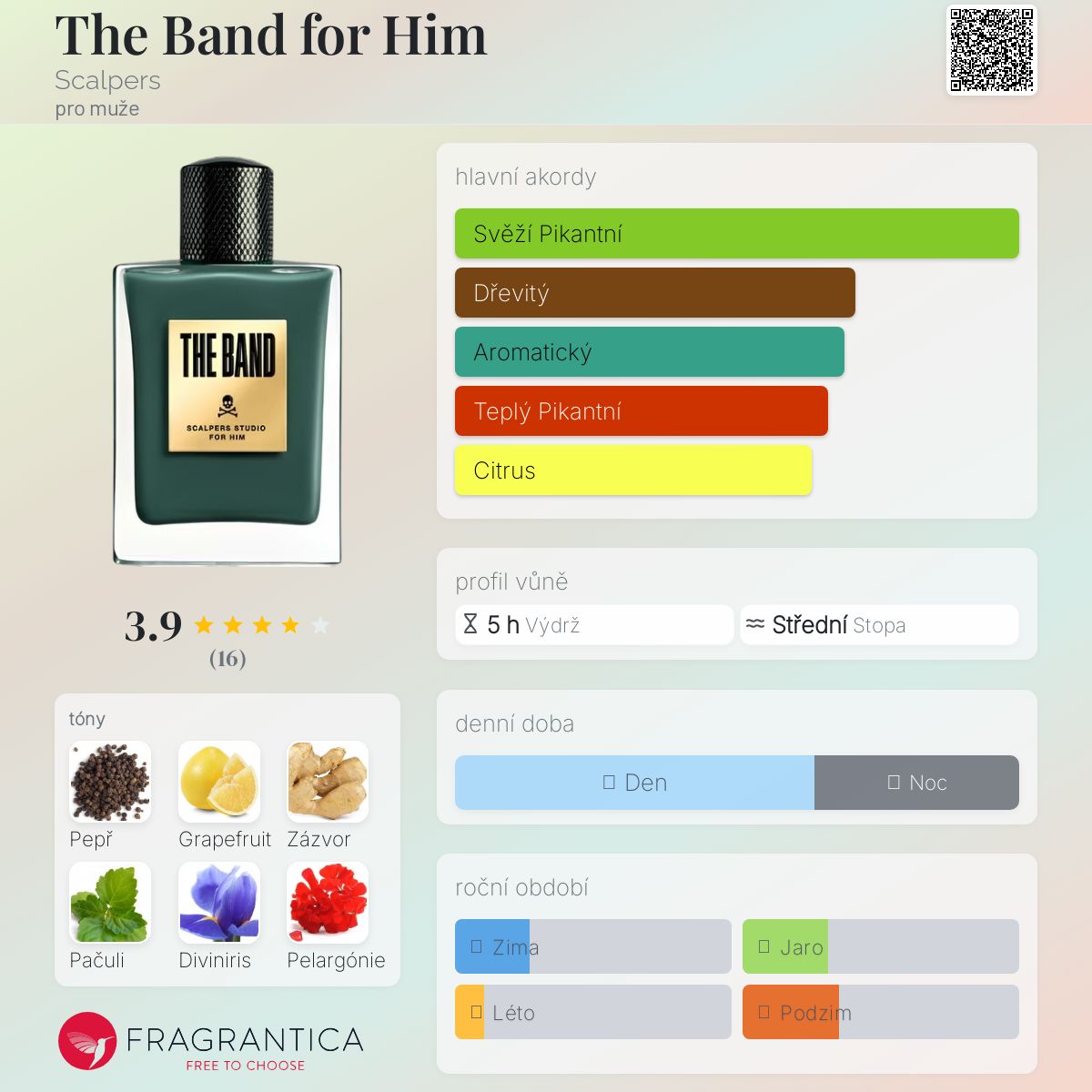 The Band for Him podle Scalpers je Woody Spicy vůně pro muže. Toto je nová vůně. The Band for Him byl/a uveden/a v roce 2025. The Band for Him byl/a vytvořen/a Pierre-Constantin Guéros a Agusti Vidal. Vrchní tóny jsou Černý pepř, Grapefruit a Zázvor; střední tóny jsouPačuli, Božský kosatec a Pelargónie ; základní tóny jsou Fazole tonka, Kůže, Cedr a Bílý tabák.