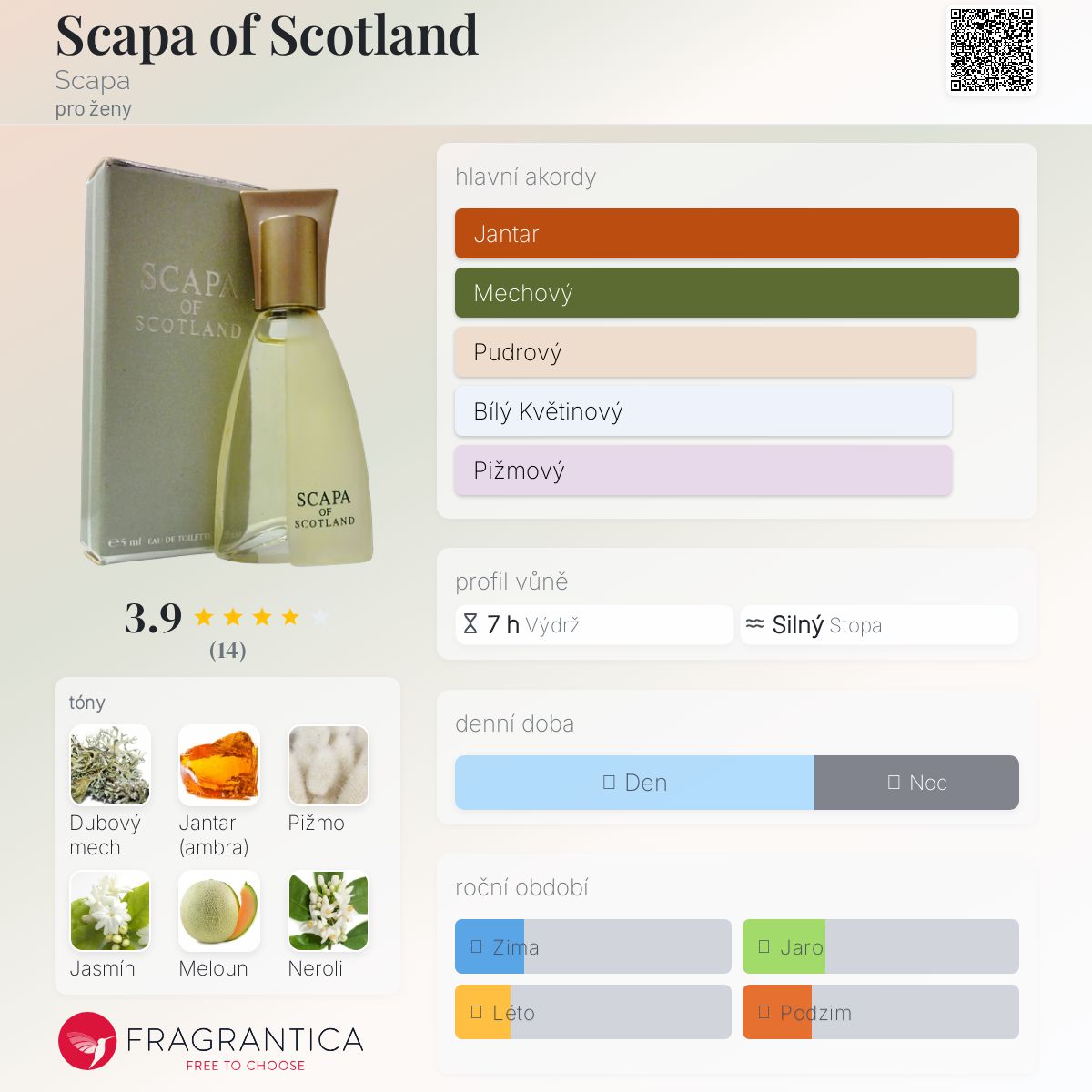 Scapa of Scotland podle Scapa je Floral Green vůně pro ženy. Scapa of Scotland byl/a uveden/a v roce 1991. Vrchní tóny jsou Jasmín, Meloun a Neroli; střední tóny jsouDubový mech, Santalové dřevo a Růže ; základní tóny jsou Jantar (ambra), Pižmo a Vanilka.