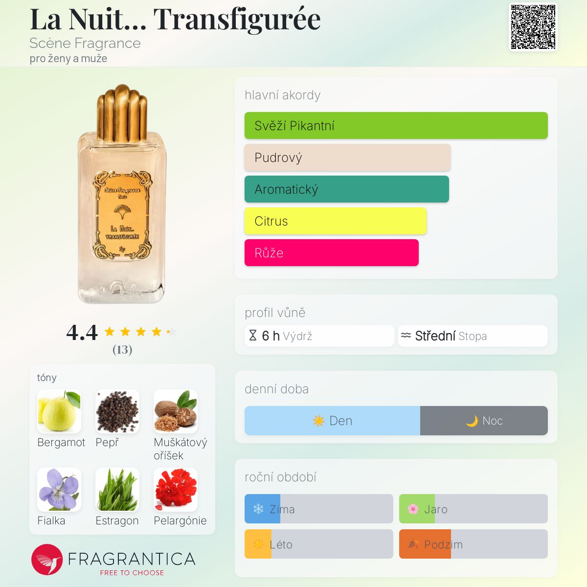 La Nuit… Transfigurée podle Scène Fragrance je Woody vůně pro ženy a muže. La Nuit… Transfigurée byl/a uveden/a v roce 2022. "Nosem" za touto vůní je Marie Schnirer. Vrchní tóny jsou Bergamot, Pepř, Muškátový oříšek a Estragon; střední tóny jsouFialka, Pelargónie a Růže ; základní tóny jsou Santalové dřevo, Ambroxan, Vanilka, Kůže a Pižmo.