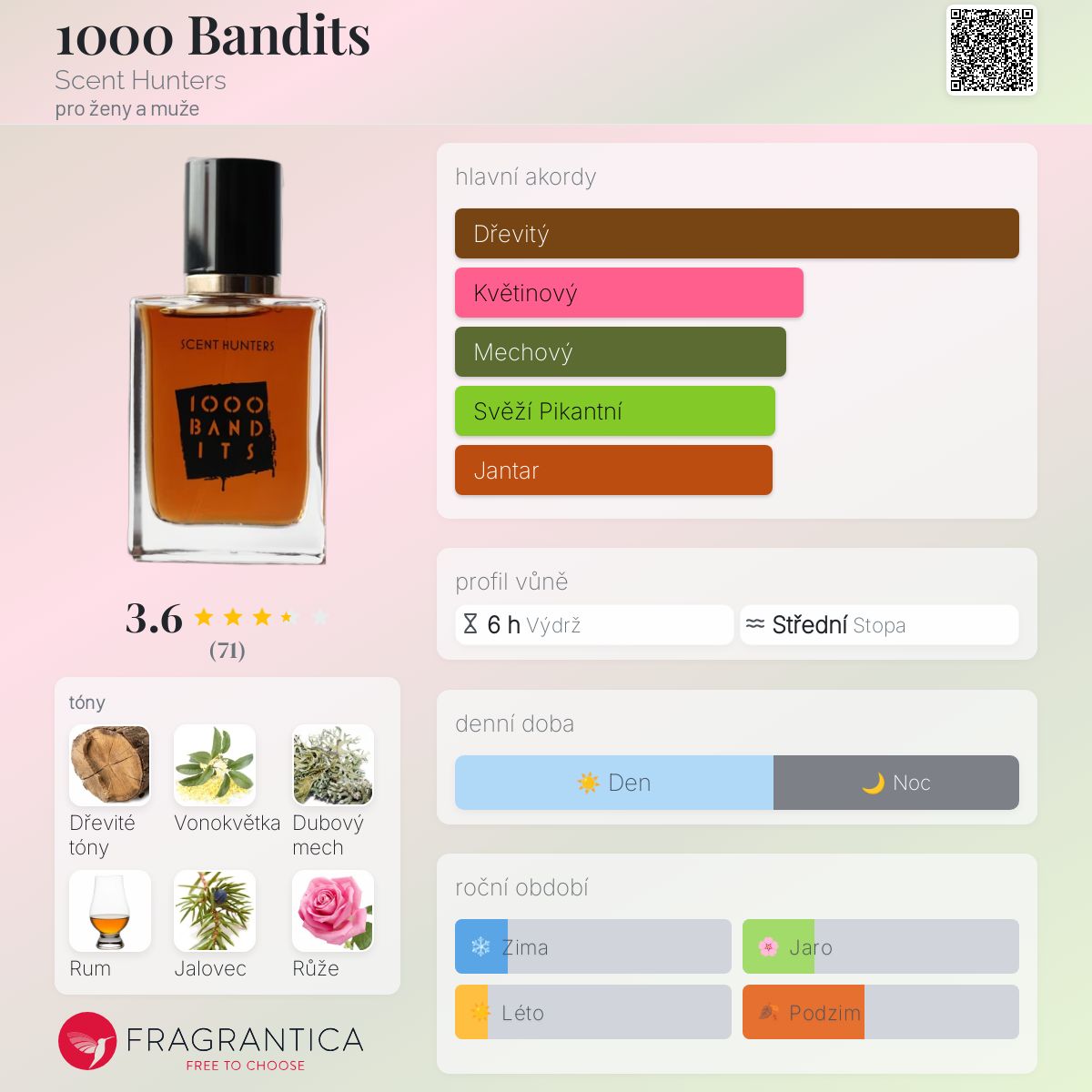 1000 Bandits podle Scent Hunters je vůně pro ženy a muže. 1000 Bandits byl/a uveden/a v roce 2023. "Nosem" za touto vůní je Angéline Leporini. Vrchní tóny jsou Jalovec, Bergamot a Mandarinka; střední tóny jsouVonokvětka, Růže a Andělika ; základní tóny jsou Dřevité tóny, Dubový mech, Rum, Agarové dřevo (oud), Mitti Attar, Papyrus, Pačuli a Jantar (ambra).