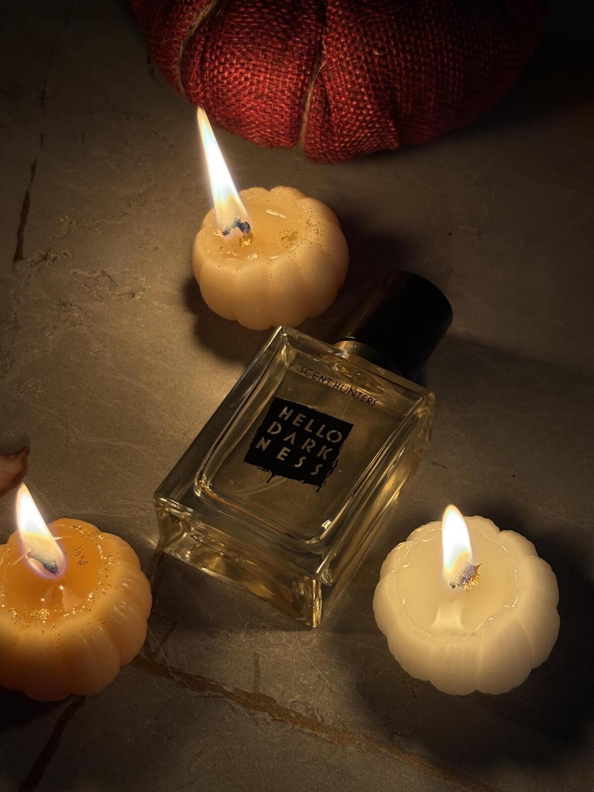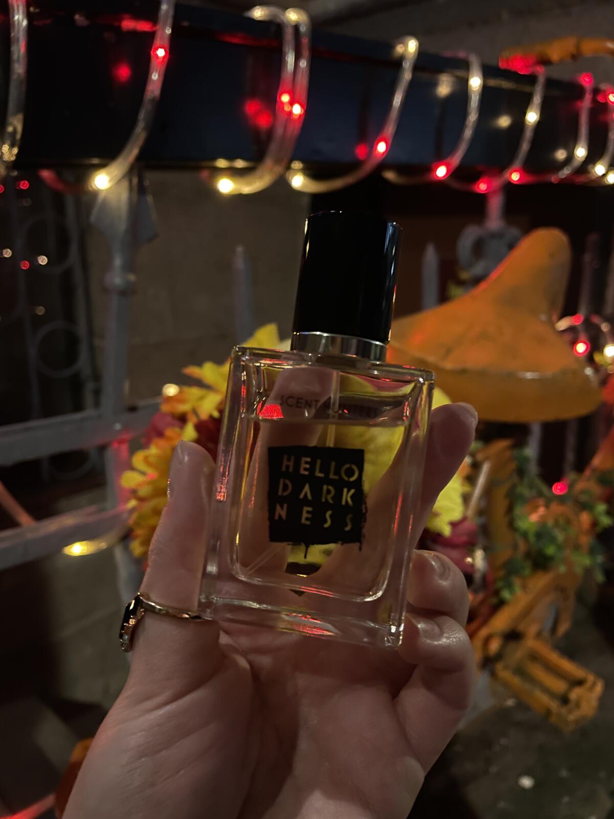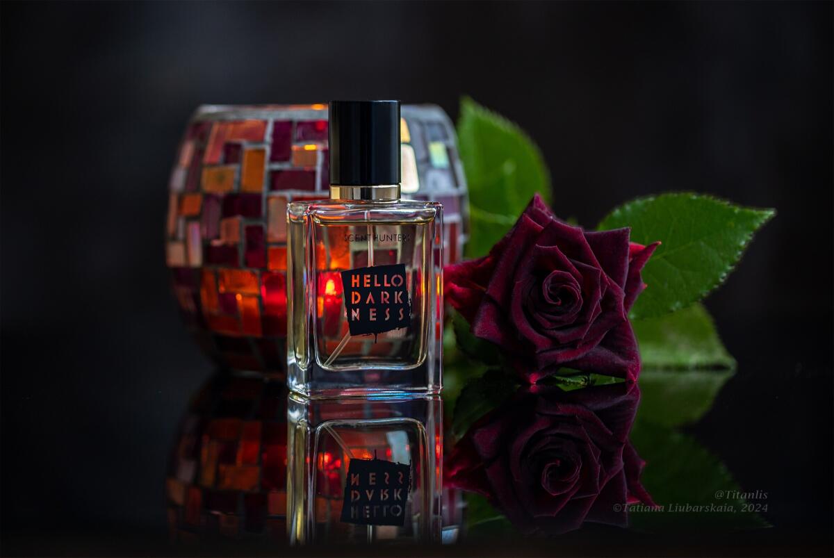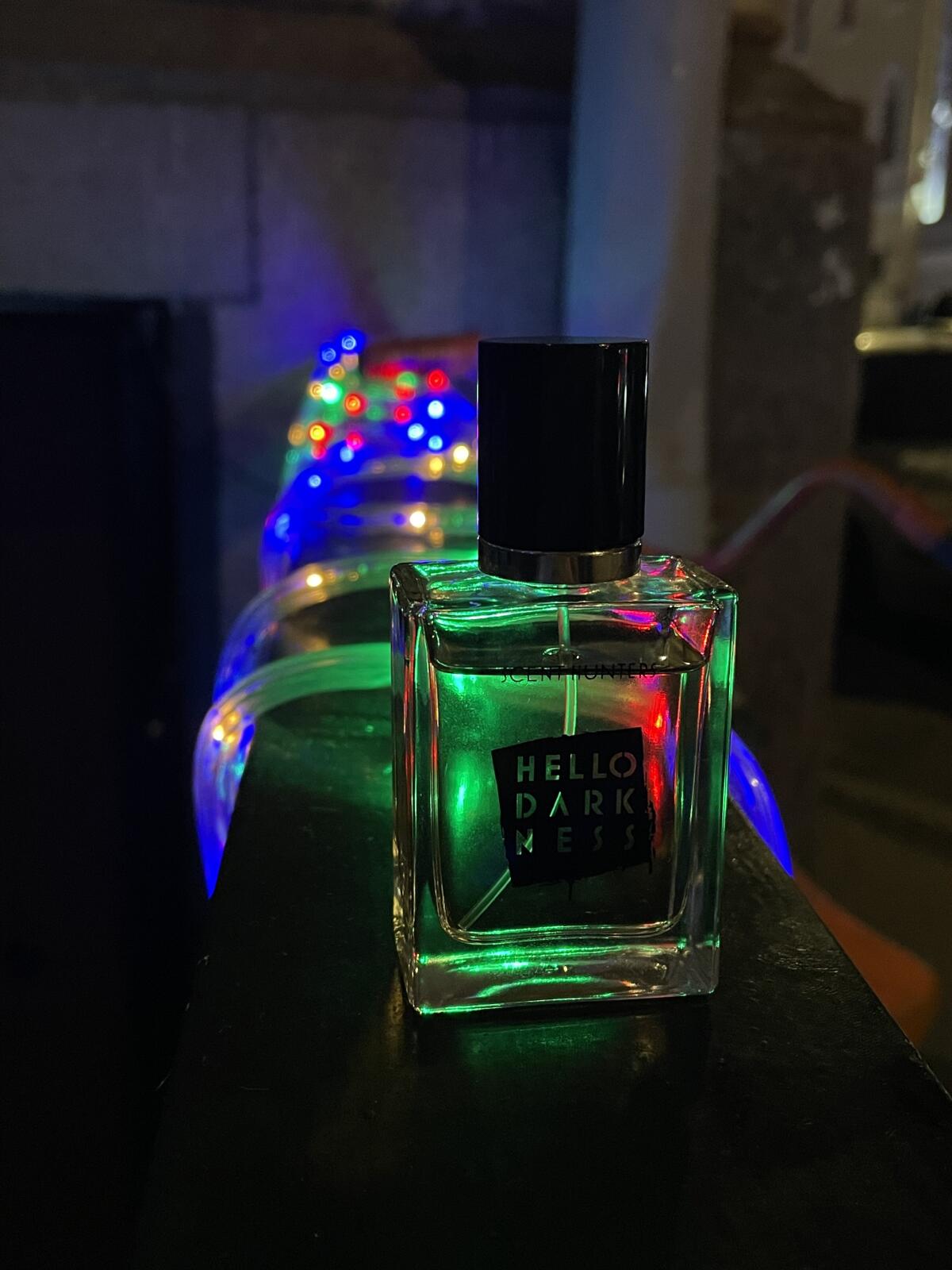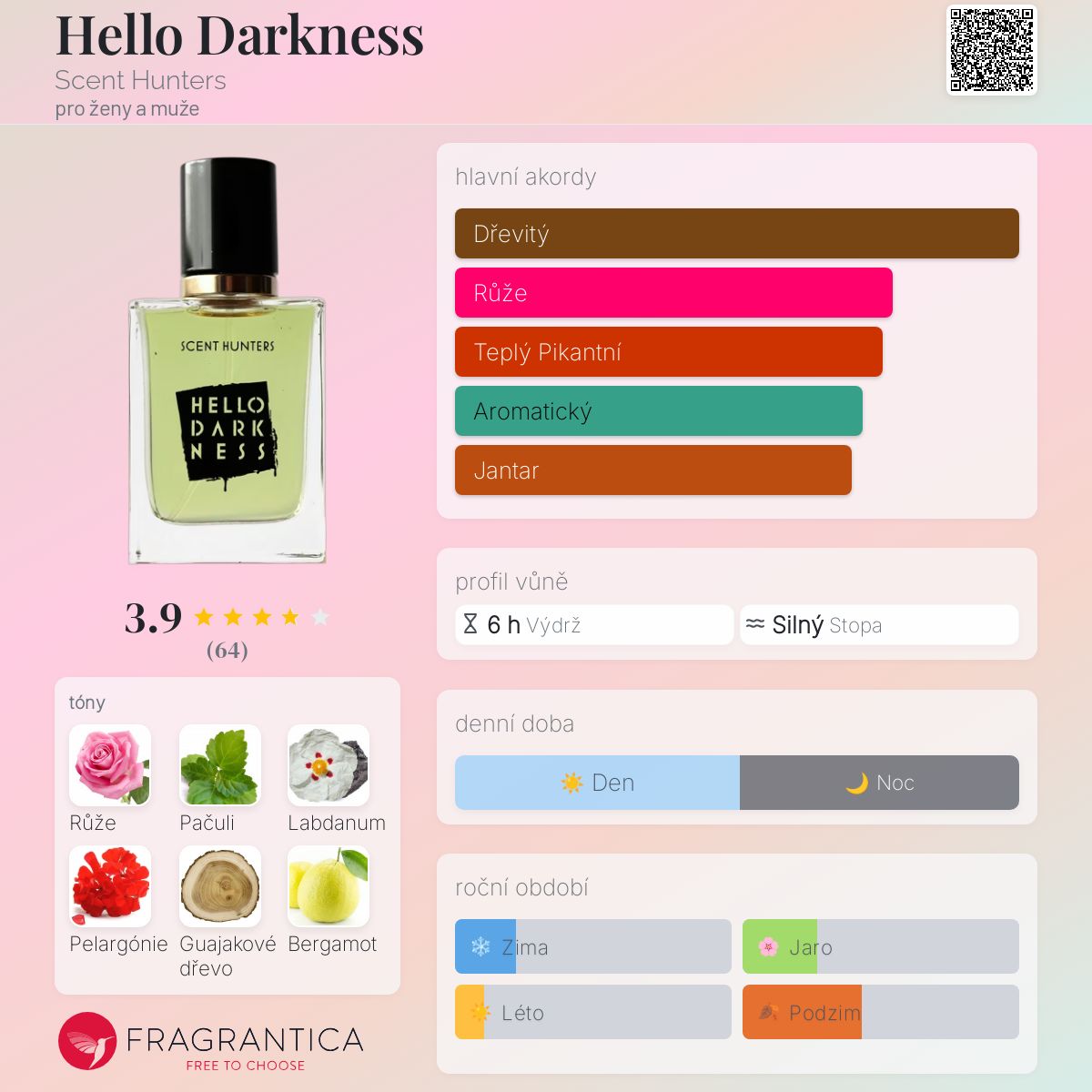 Hello Darkness podle Scent Hunters je Chypre Floral vůně pro ženy a muže. Hello Darkness byl/a uveden/a v roce 2023. "Nosem" za touto vůní je Olaf Larsen. Vrchní tóny jsou Bergamot a Šafrán; střední tóny jsouRůže, Pelargónie, Karafiát, Jasmín a Konvalinka ; základní tóny jsou Pačuli, Labdanum, Guajakové dřevo, Vetiver, Papyrus, Pižmo a Jantar (ambra).