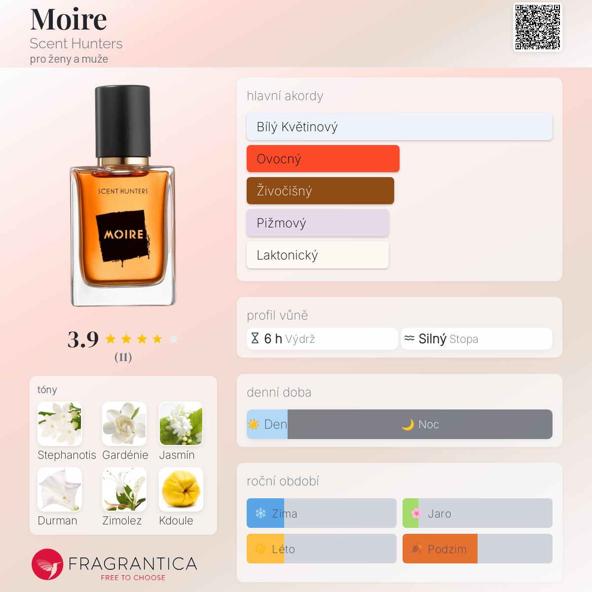 Moire podle Scent Hunters je vůně pro ženy a muže. Toto je nová vůně. Moire byl/a uveden/a v roce 2025. "Nosem" za touto vůní je Kevin Mathys.