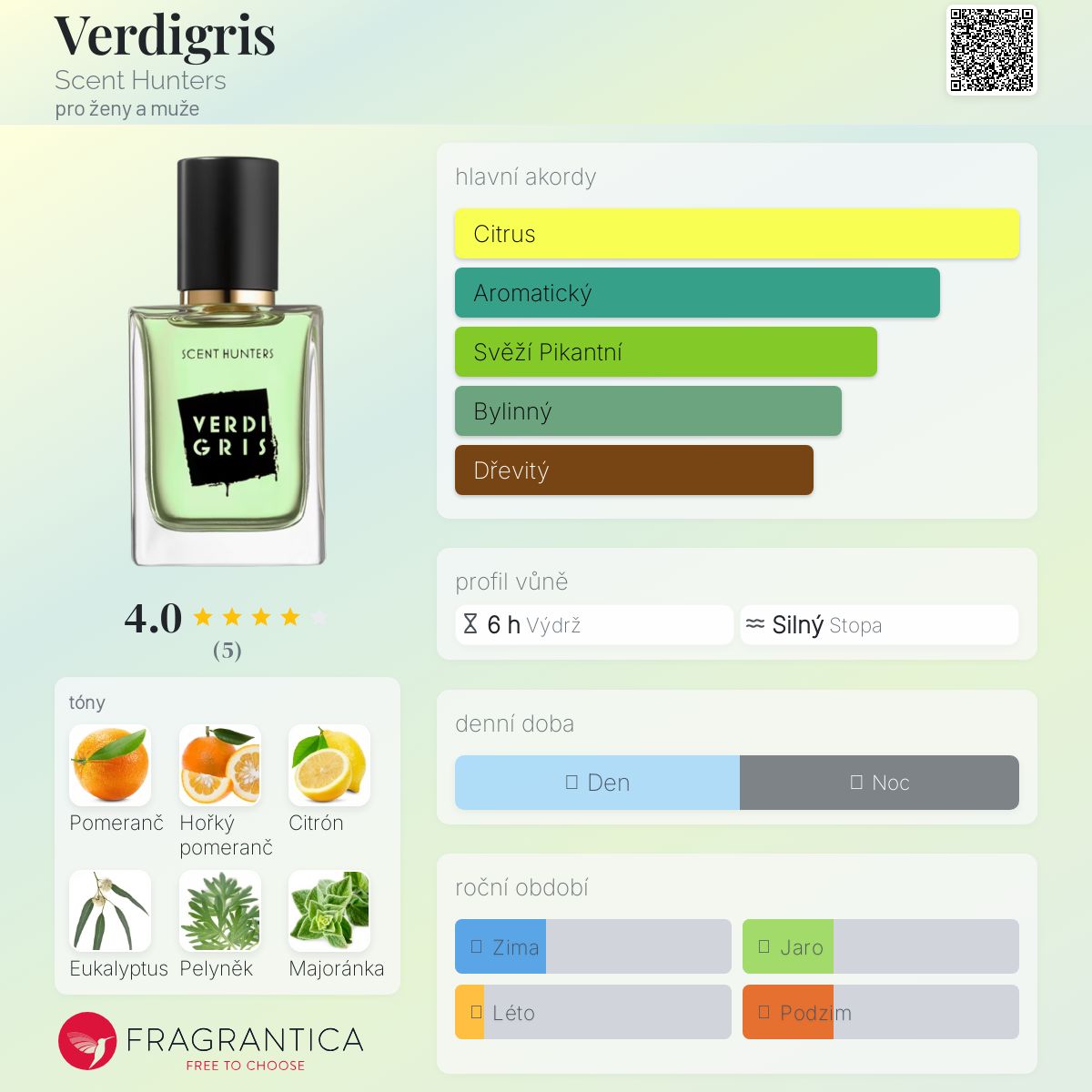 Verdigris podle Scent Hunters je vůně pro ženy a muže. Toto je nová vůně. Verdigris byl/a uveden/a v roce 2025. "Nosem" za touto vůní je Julien Plos.