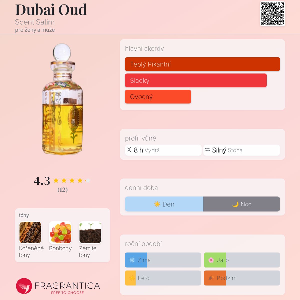 Dubai Oud podle Scent Salim je vůně pro ženy a muže. Dubai Oud byl/a uveden/a v roce 2013. Dubai Oud byl/a vytvořen/a Mary Salim, Moses Salim a Ilyas Salim. Vrchní tón je Sladké tóny ; střední tón jeKořeněné tóny ; základní tón je Zemité tóny.