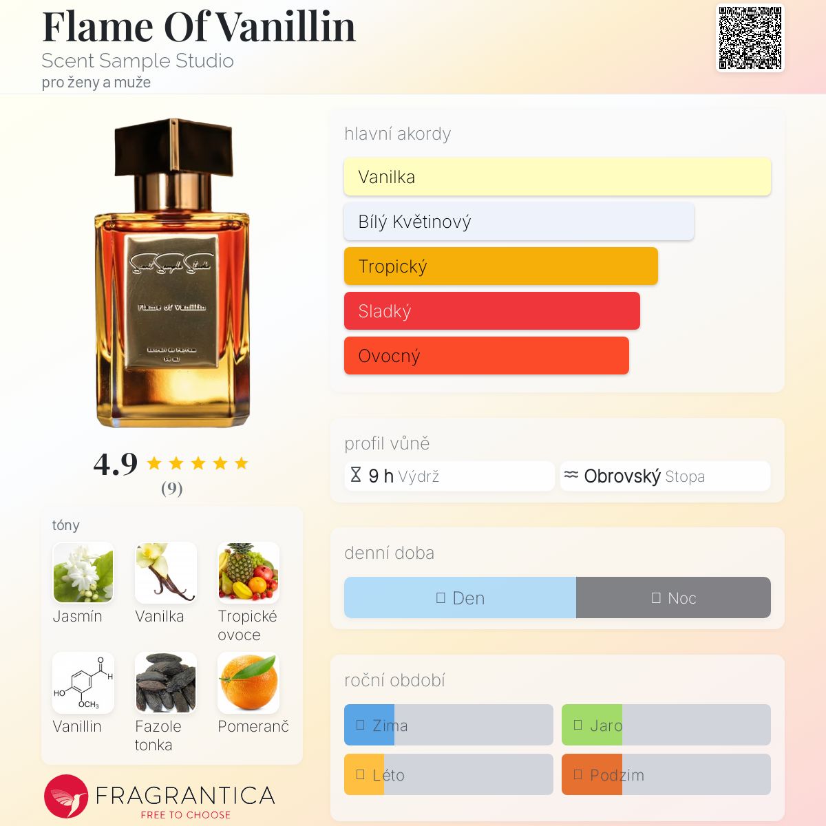 Flame Of Vanillin podle Scent Sample Studio je vůně pro ženy a muže. Toto je nová vůně. Flame Of Vanillin byl/a uveden/a v roce 2024. "Nosem" za touto vůní je Burak Turkmen. Vrchní tón je Pomeranč ; střední tóny jsouJasmín, Tropické ovoce, Vanillin a Kakaový lusk ; základní tóny jsou Vanilka, Fazole tonka a Pačuli.