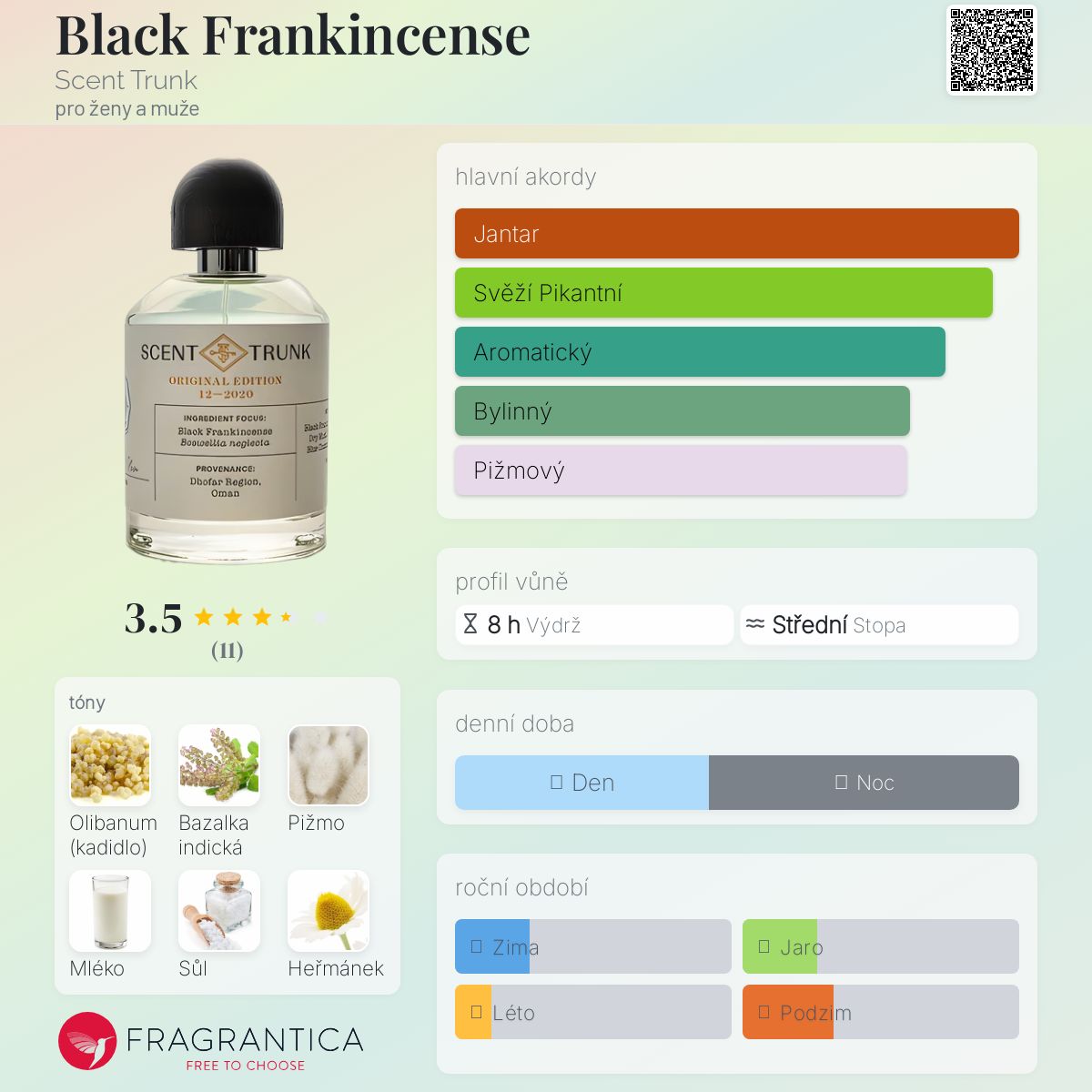 Black Frankincense podle Scent Trunk je Orientální vůně pro ženy a muže. Black Frankincense byl/a uveden/a v roce 2020. "Nosem" za touto vůní je Dana El Masri.