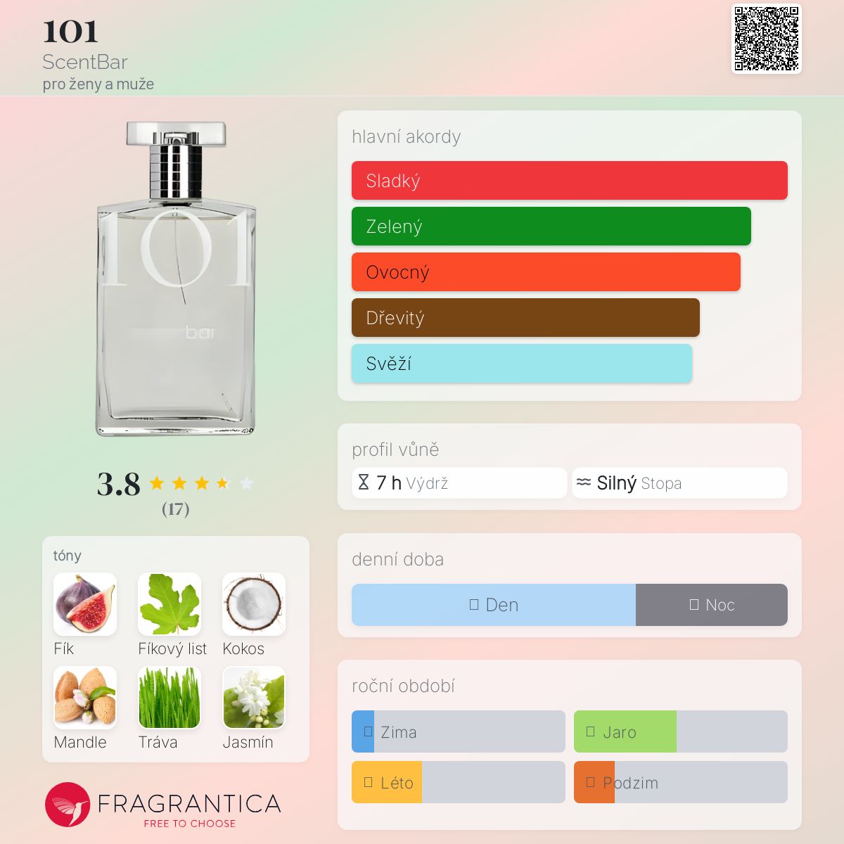 101 podle ScentBar je Floral Green vůně pro ženy a muže. "Nosem" za touto vůní je Viola Pompili. Vrchní tóny jsou Fíkový list, Tráva a Cypřiš; střední tóny jsouFík, Jasmín, Levandule, Brambořík a Fazole tonka ; základní tóny jsou Kokos, Mandlové mléko, Santalové dřevo a Dřevité tóny.