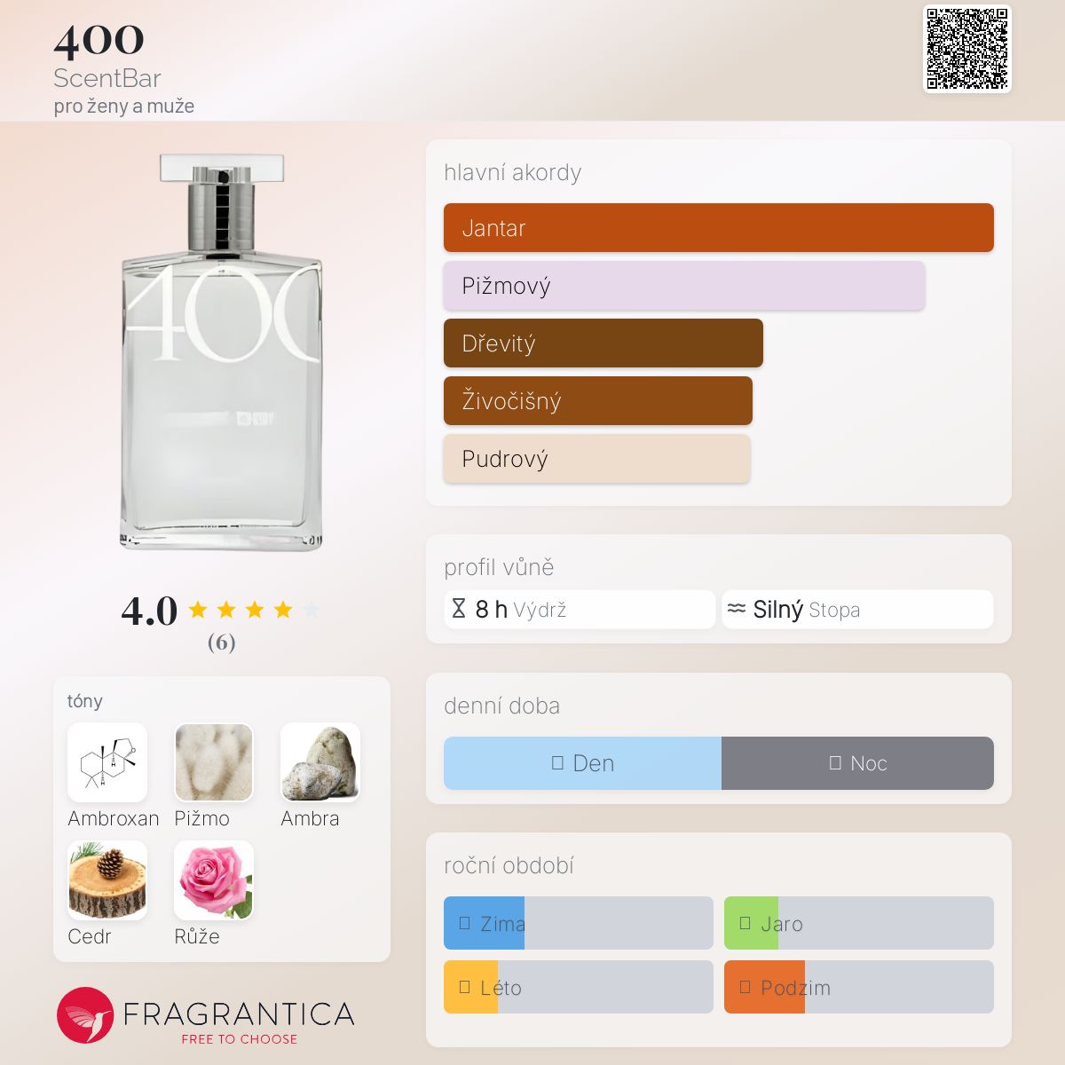 400 podle ScentBar je Orientální vůně pro ženy a muže. "Nosem" za touto vůní je Viola Pompili. Vrchní tón je Ambra ; střední tóny jsouAmbroxan a Cedr ; základní tóny jsou Pižmo a Růže.