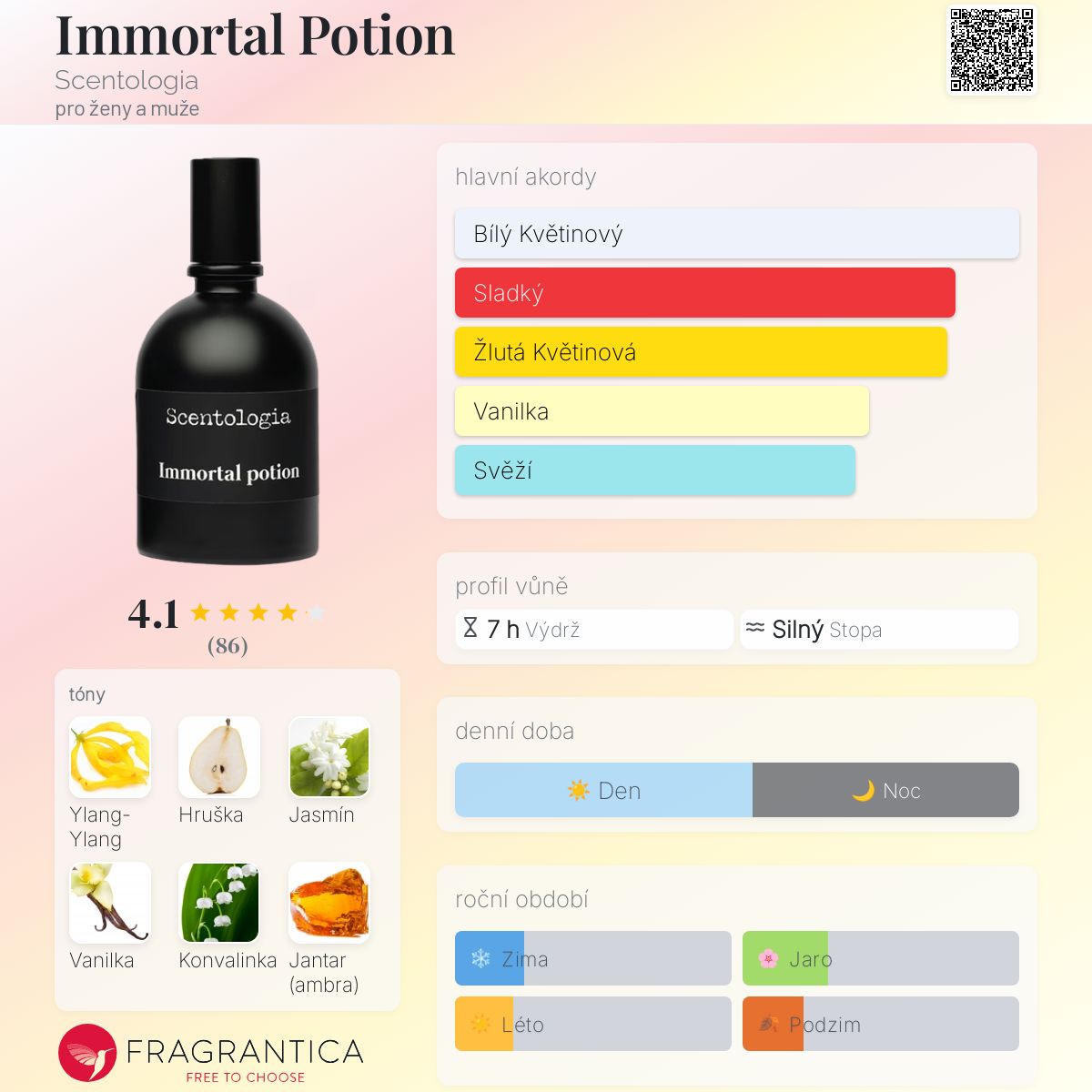 Immortal Potion podle Scentologia je Orientální Floral vůně pro ženy a muže. Toto je nová vůně. Immortal Potion byl/a uveden/a v roce 2024. Vrchní tóny jsou Hruška a Černý rybíz; střední tóny jsouYlang-Ylang, Jasmín, Konvalinka a Orris ; základní tóny jsou Vanilka, Jantar (ambra), Pryskyřičné tóny, Pačuli a Pižmo.