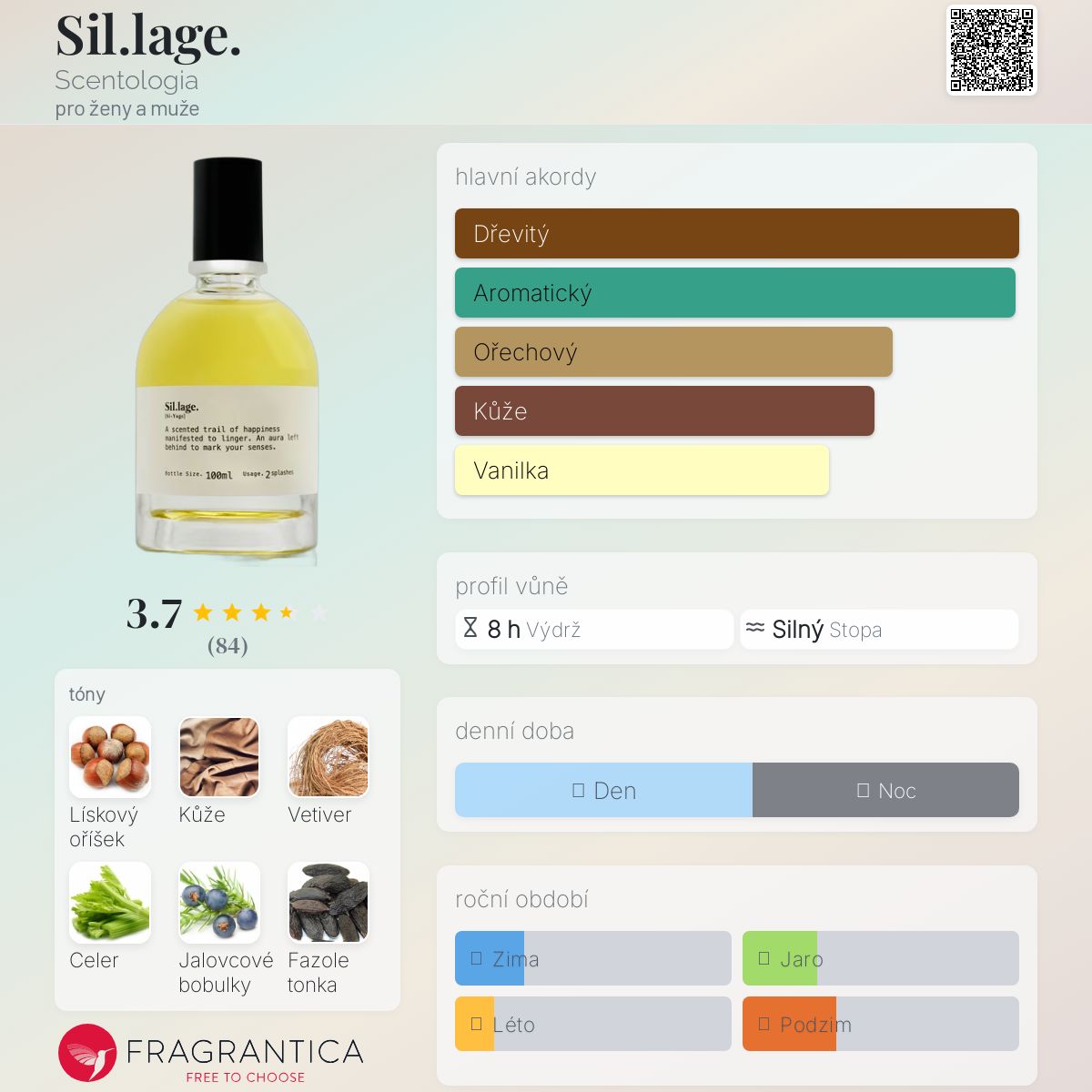 Sil.lage. podle Scentologia je Orientální Fougere vůně pro ženy a muže. Sil.lage. byl/a uveden/a v roce 2021. "Nosem" za touto vůní je Marzia Tissino. Vrchní tóny jsou Celer, Jalovcové bobulky, Pomeranč a Bergamot; střední tóny jsouLískový oříšek, Kůže, Fazole tonka a Ovocné tóny ; základní tóny jsou Vetiver, Vanilka, Dřevité tóny a Jantar (ambra).