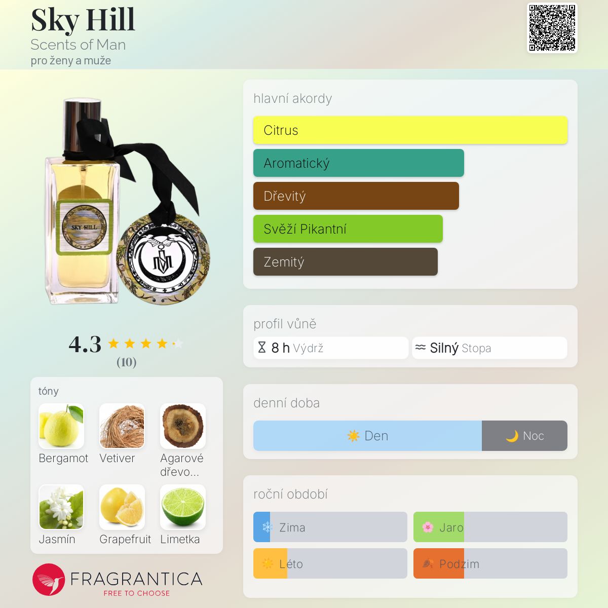 Sky Hill podle Scents of Man je vůně pro ženy a muže. "Nosem" za touto vůní je Andrea Byrne. Vrchní tóny jsou Bergamot, Grapefruit, Limetka a Mandarinka; střední tóny jsouVetiver, Jasmín, Magnólie, Šafrán a Benzoin ; základní tóny jsou Agarové dřevo (oud), Pačuli, Pižmo, Galbanum a List skořice.