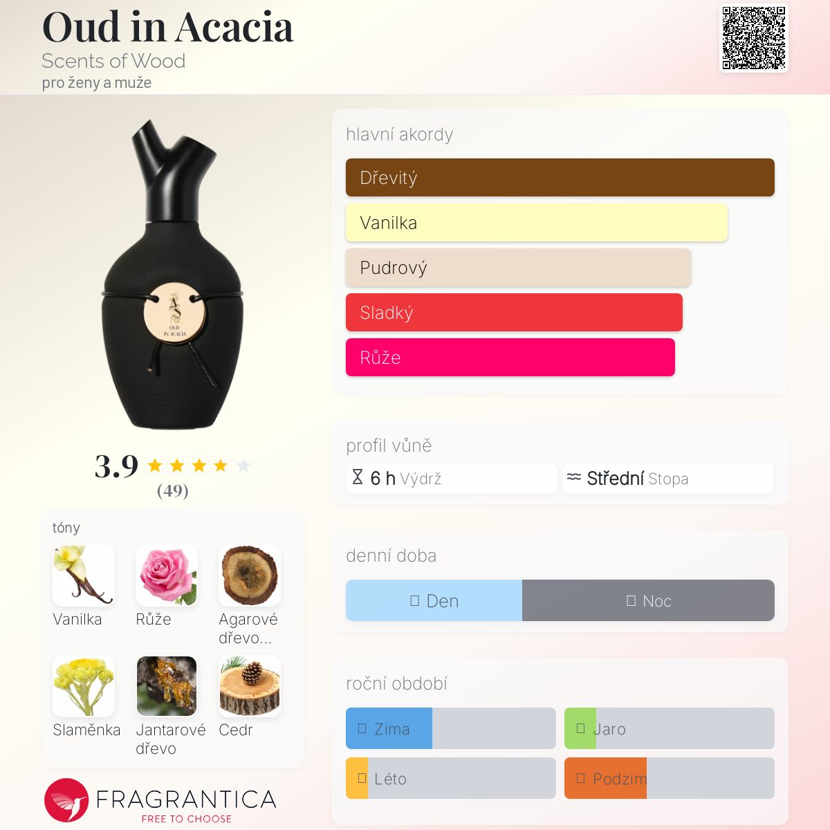 Oud in Acacia podle Scents of Wood je Floral vůně pro ženy a muže. Oud in Acacia byl/a uveden/a v roce 2020. "Nosem" za touto vůní je Yves Cassar.