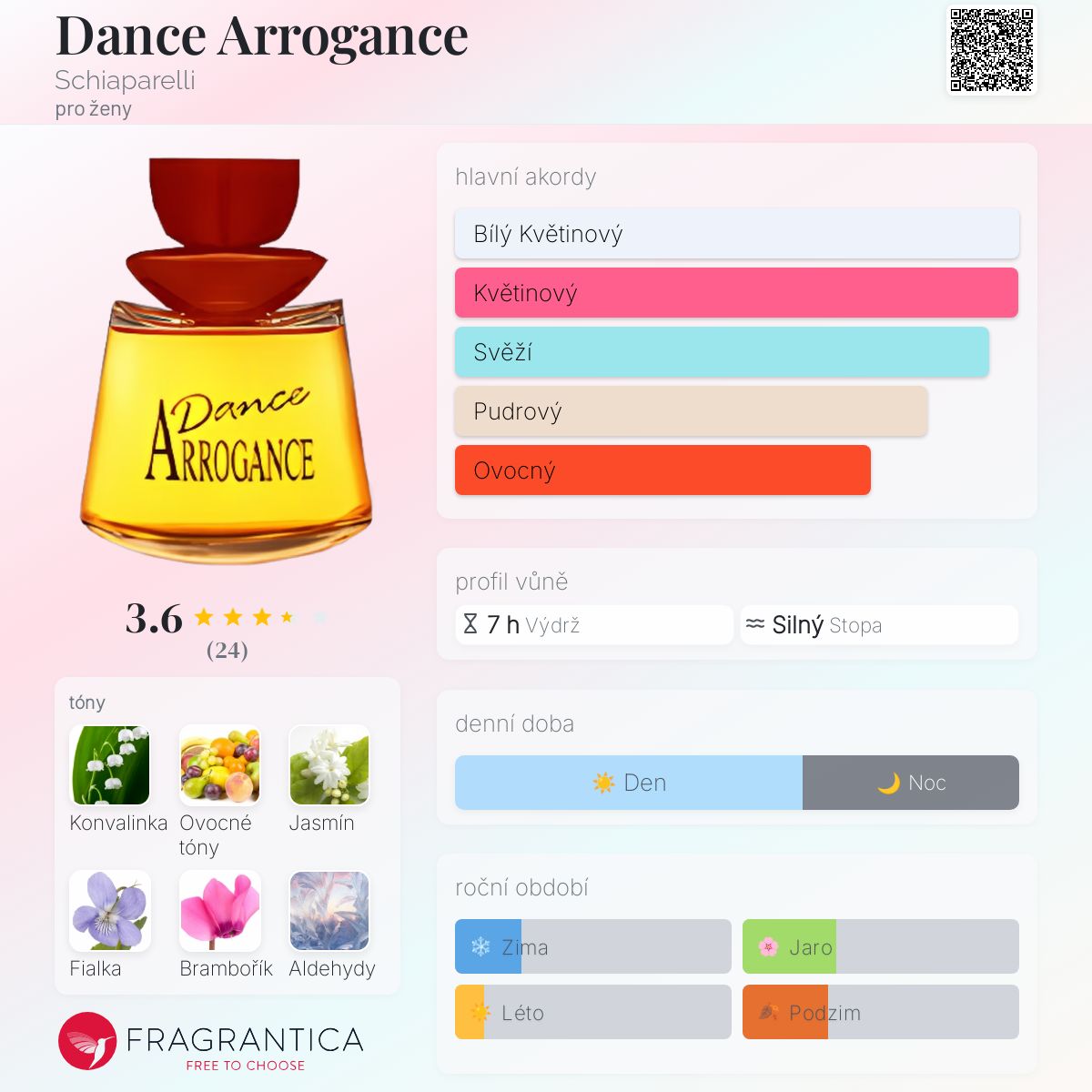 Dance Arrogance podle Schiaparelli je Floral Green vůně pro ženy. Dance Arrogance byl/a uveden/a v roce 1992. Vrchní tóny jsou Ovocné tóny, Aldehydy, Koriandr, Zelené tóny a Bergamot; střední tóny jsouKonvalinka, Jasmín, Fialka, Brambořík a Růže ; základní tóny jsou Pižmo, Orchidej, Dubový mech a Santalové dřevo.
