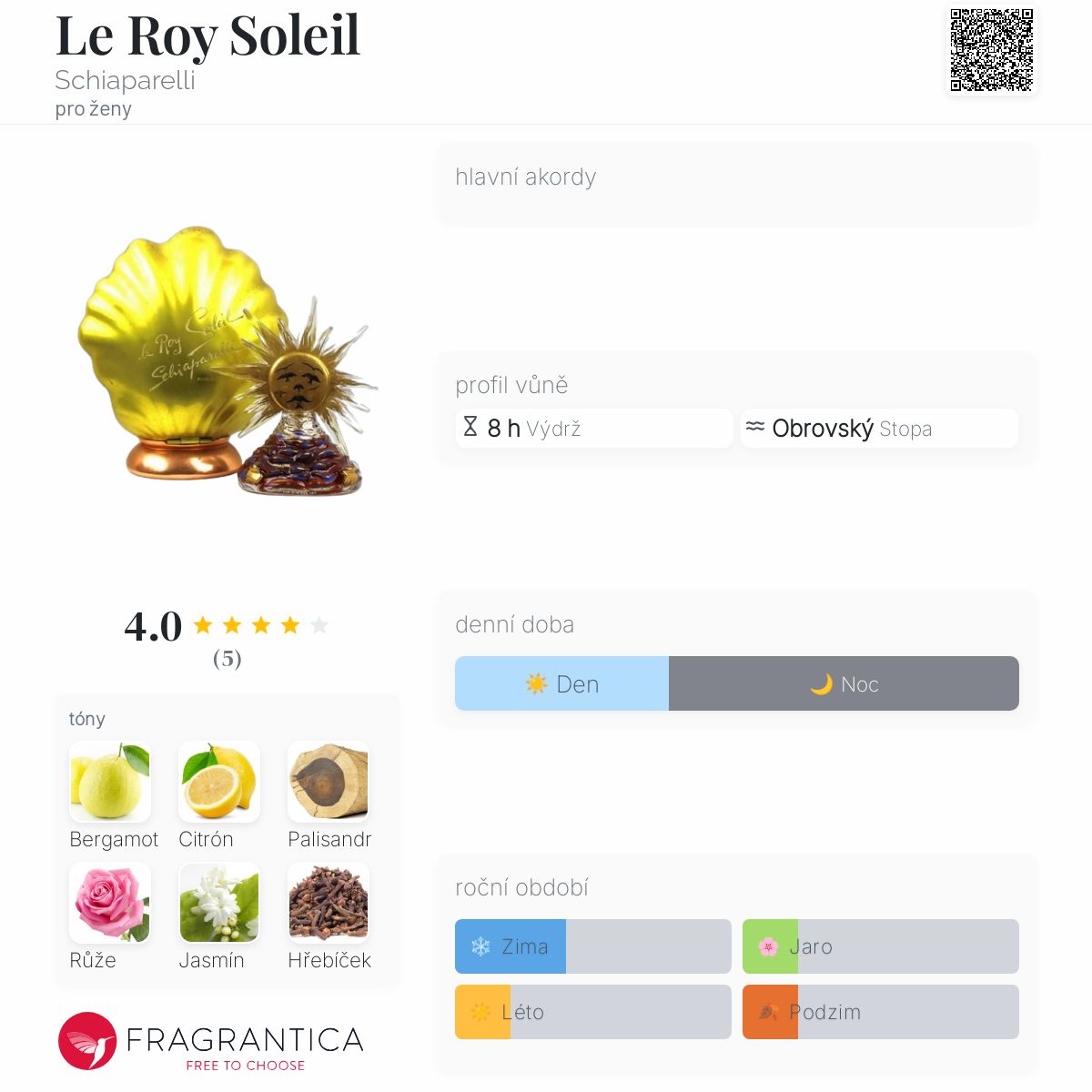Le Roy Soleil podle Schiaparelli je Floral vůně pro ženy. Le Roy Soleil byl/a uveden/a v roce 1946. Vrchní tóny jsou Bergamot, Citrón, Palisandr a Ananas; střední tóny jsouRůže, Jasmín, Hřebíček, Skořice a Meruňka ; základní tóny jsou Fazole tonka, Pačuli, Santalové dřevo, Pižmo, Vetiver a Vanilka.