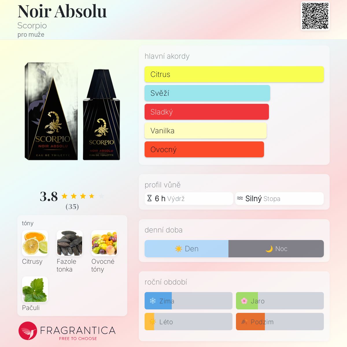 Noir Absolu podle Scorpio je Aromatic Fougere vůně pro muže. Noir Absolu byl/a uveden/a v roce 2006. Vrchní tón je Citrusy ; střední tón jeOvocné tóny ; základní tóny jsou Fazole tonka a Pačuli.