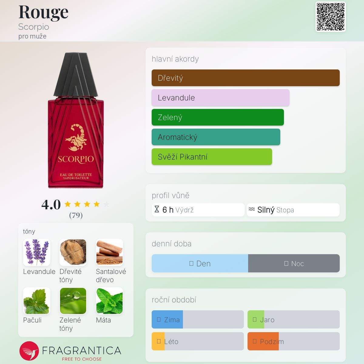 Rouge podle Scorpio je vůně pro muže. Rouge byl/a uveden/a v roce 1989. Vrchní tóny jsou Bergamot a Citrusy; střední tóny jsouLevandule, Bylinné tóny a Máta ; základní tóny jsou Dřevité tóny, Santalové dřevo a Pačuli.