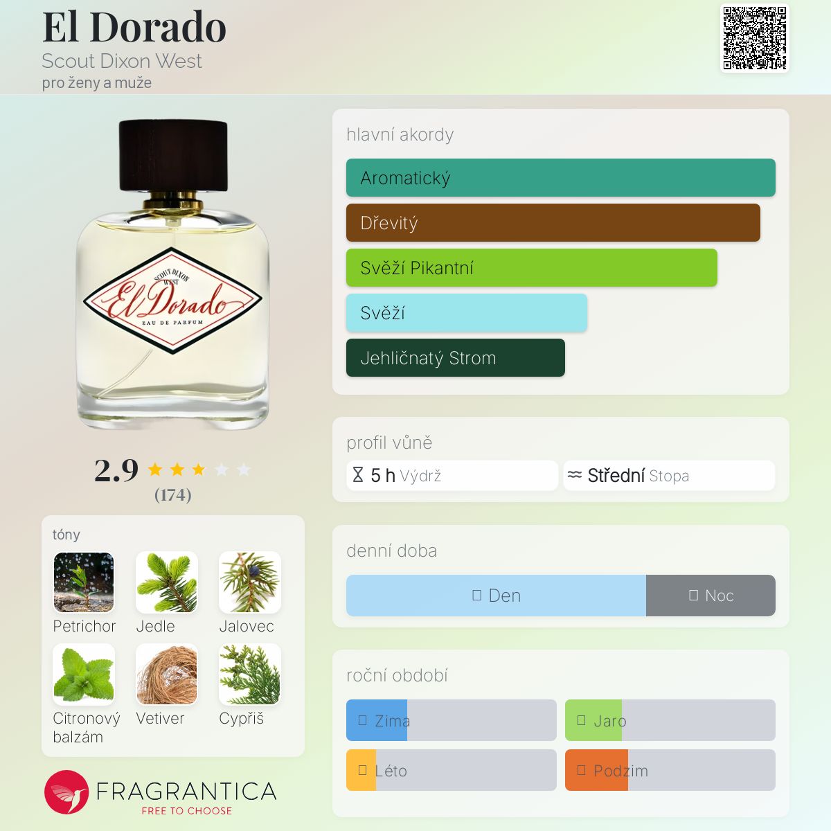 El Dorado podle Scout Dixon West je Woody Aromatic vůně pro ženy a muže. Toto je nová vůně. El Dorado byl/a uveden/a v roce 2024. Vrchní tóny jsou Petrichor, Jalovec a Citronový balzám; střední tóny jsouCypřiš, Rozmarýn a Labdanum ; základní tóny jsou Jedle, Vetiver a Guajakové dřevo.