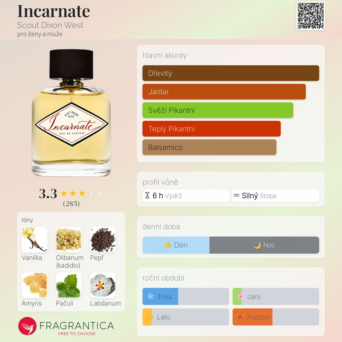 Incarnate podle Scout Dixon West je Orientální Woody vůně pro ženy a muže. Toto je nová vůně. Incarnate byl/a uveden/a v roce 2024. "Nosem" za touto vůní je Yann Vasnier. Vrchní tóny jsou Bílý pepř, Amyris a Fialkový list; střední tóny jsouVanilka, Olibanum a Labdanum ; základní tóny jsou Pačuli, Santalové dřevo a Pižmo.
