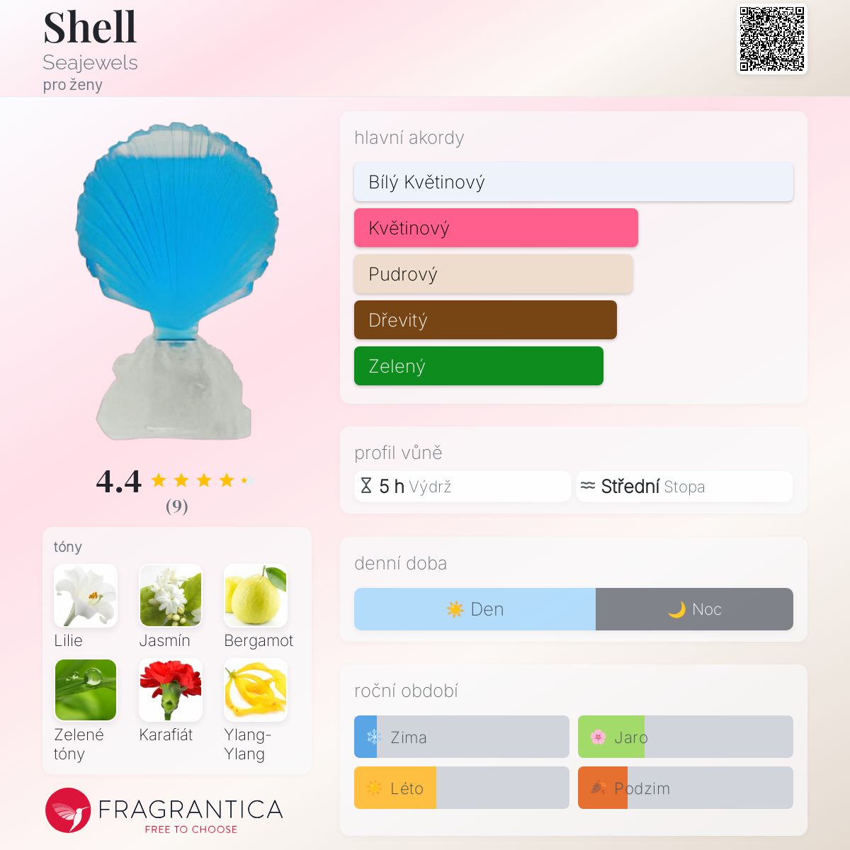 Shell podle Seajewels je Floral vůně pro ženy. Vrchní tóny jsou Bergamot a Zelené tóny; střední tóny jsouLilie, Jasmín, Karafiát, Ylang-Ylang, Růže a Fialka ; základní tóny jsou Pižmo, Virginský cedr, Jantar (ambra) a Vanilka.