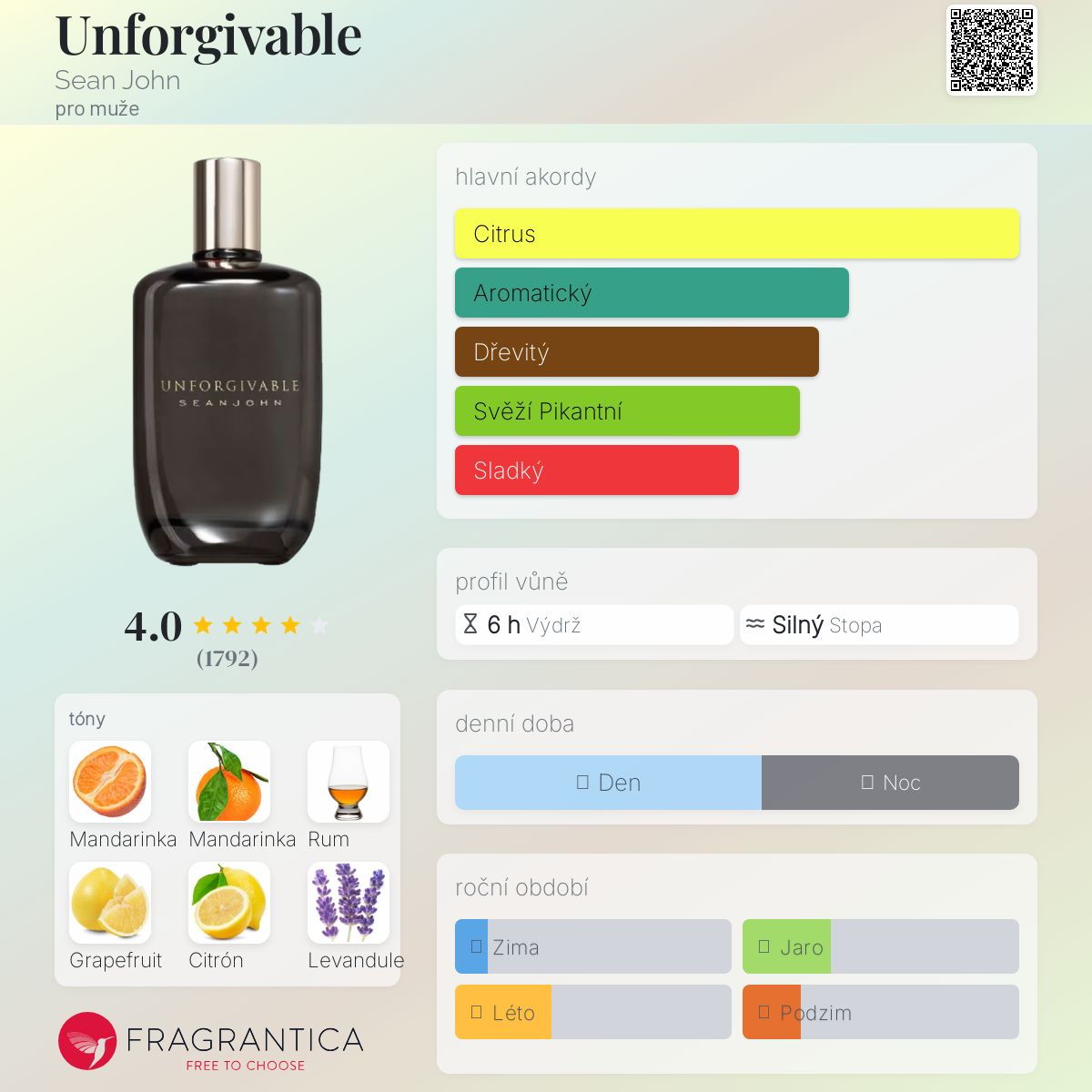 Unforgivable podle Sean John je Aromatic Fougere vůně pro muže. Unforgivable byl/a uveden/a v roce 2006. Unforgivable byl/a vytvořen/a David Apel, Pierre Negrin, Aurélien Guichard a Caroline Sabas. Vrchní tóny jsou Mandarinka, Zelená mandarinka, Grapefruit, Sicilský citron, Bergamot, Březový list, Bazalka a Jalovec; střední tóny jsouLevandule, Šalvěj muškátová a Kosatec ; základní tóny jsou Rum, Kašmírové dřevo, Australské santalové dřevo, Fazole tonka a Jantar (ambra). Tento parfém je vítězem oceněníFiFi Award Fragrance Of The Year Men`s Luxe 2007 .