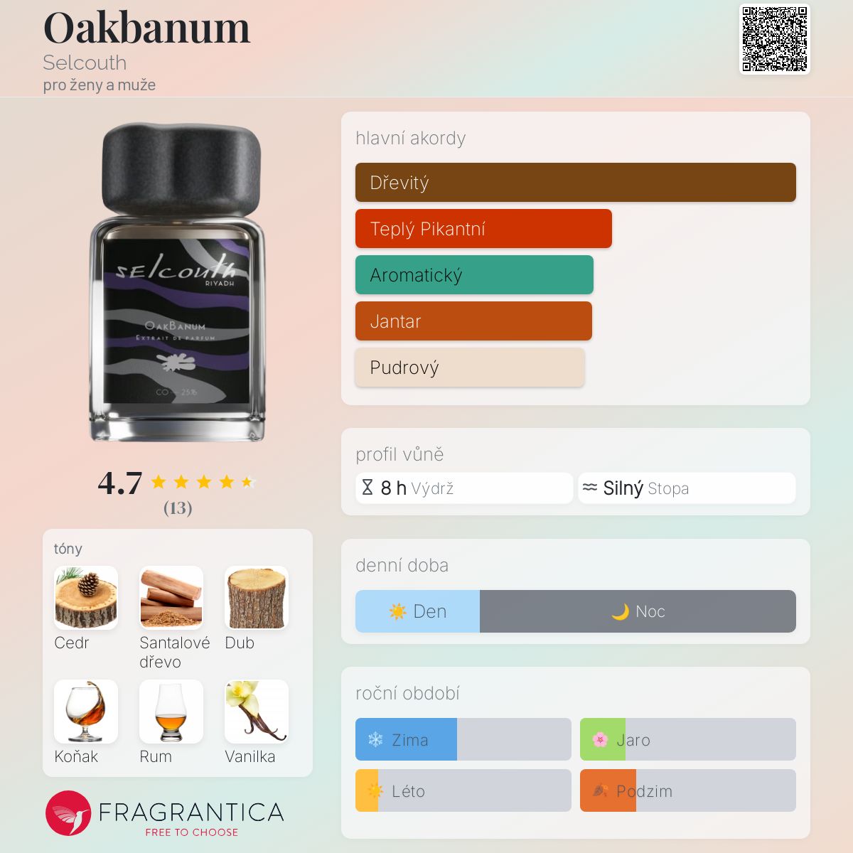 Oakbanum podle Selcouth je Aromatic Spicy vůně pro ženy a muže. Toto je nová vůně. Oakbanum byl/a uveden/a v roce 2025. "Nosem" za touto vůní je Abdulaziz Alshaibani. Vrchní tóny jsou Koňak, Pryskyřice elemi, Mandarinka, Růžový pepř, Bergamot a Kardamom; střední tóny jsouRum, Dřevité tóny, Káva CO2, Whisky, Vonokvětka, Jantarové dřevo a Davana ; základní tóny jsou Texaský cedr, Santalové dřevo, Dub, Bourbonská vanilka, Olibanum, Pačuli, Jantar (ambra), Agarové dřevo (oud) a Pižmo.