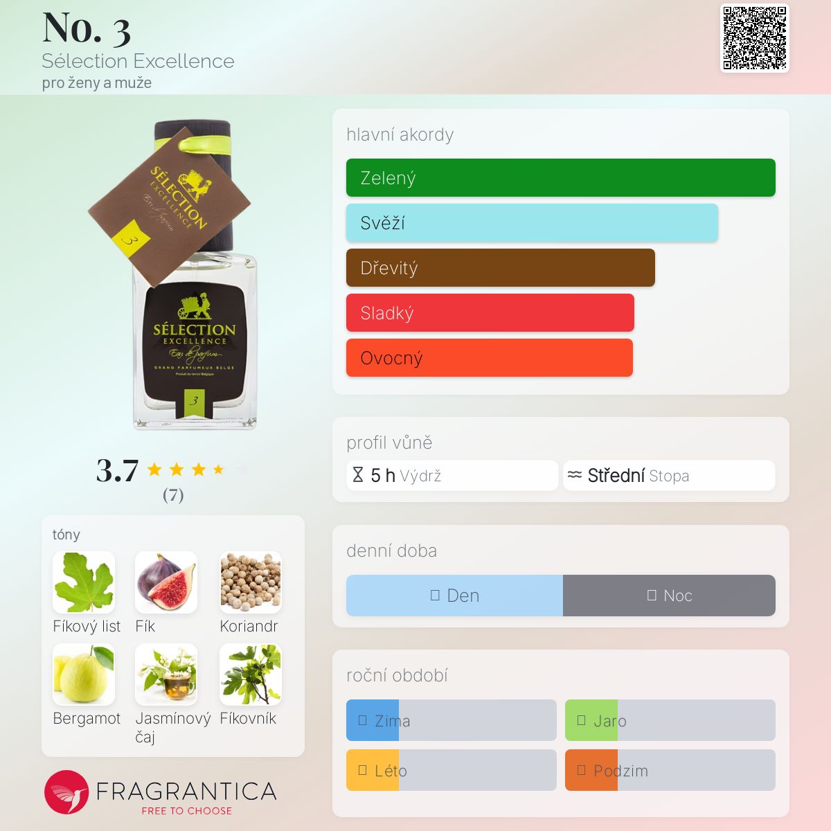 No. 3 podle Sélection Excellence je Floral Fruity vůně pro ženy a muže. Vrchní tóny jsou Fíkový list, Fík, Koriandr a Bergamot; střední tóny jsouJasmínový čaj a Červený rybíz ; základní tóny jsou Fíkovník a Pižmo.