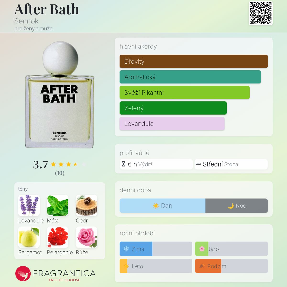 After Bath podle Sennok je Floral Woody Musk vůně pro ženy a muže. Vrchní tóny jsou Levandule, Máta a Bergamot; střední tóny jsouPelargónie, Růže a Kosatec ; základní tóny jsou Cedr, Santalové dřevo a Pačuli.