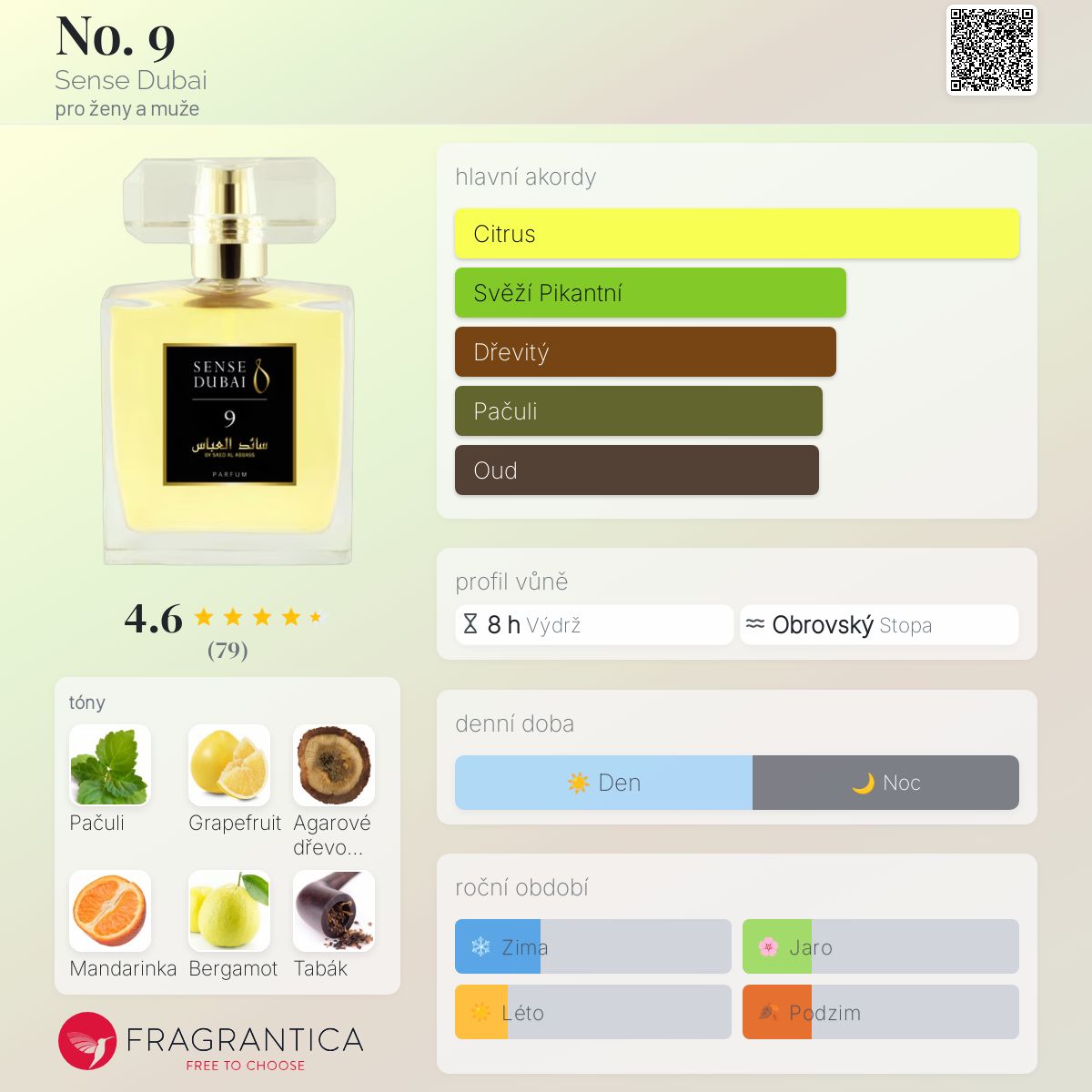 No. 9 podle Sense Dubai je Woody Spicy vůně pro ženy a muže. No. 9 byl/a uveden/a v roce 2015. Vrchní tóny jsou Grapefruit, Mandarinka, Bergamot, Černý pepř, Růžový pepř a Muškátový oříšek; střední tóny jsouPačuli, Agarové dřevo (oud), Cedr, Vetiver a Labdanum ; základní tóny jsou Tabákový list, Jantar (ambra), Kůže a Pižmo.