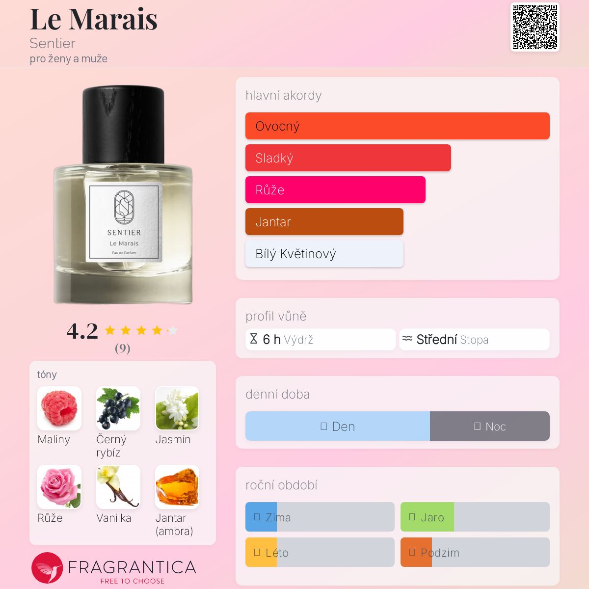 Le Marais podle Sentier je Floral Fruity vůně pro ženy a muže. Toto je nová vůně. Le Marais byl/a uveden/a v roce 2024. Vrchní tóny jsou Maliny a Černý rybíz; střední tóny jsouJasmín a Růže ; základní tóny jsou Vanilka a Jantar (ambra).