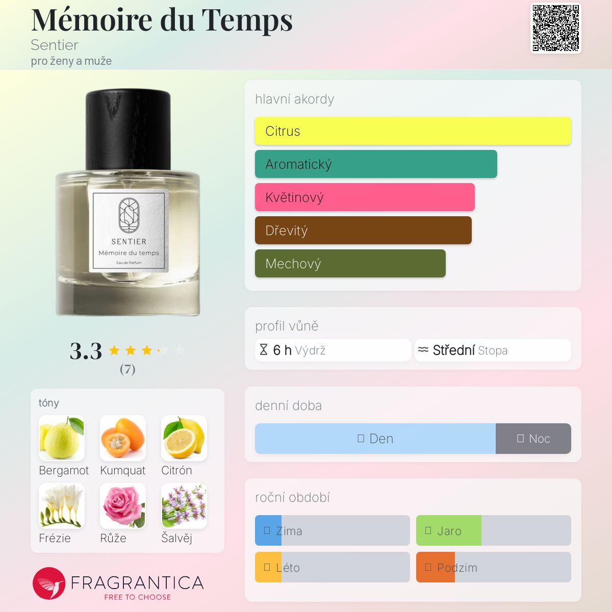 Mémoire du Temps podle Sentier je Citrus Aromatic vůně pro ženy a muže. Toto je nová vůně. Mémoire du Temps byl/a uveden/a v roce 2024. Vrchní tóny jsou Bergamot, Kumquat a Citrón; střední tóny jsouFrézie, Růže a Šalvěj ; základní tóny jsou Cedr a Mech.