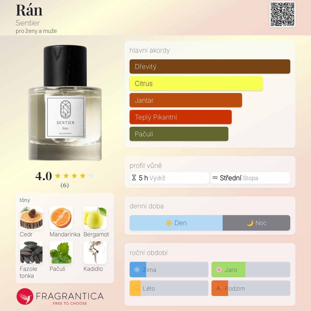 Rán podle Sentier je Orientální Woody vůně pro ženy a muže. Toto je nová vůně. Rán byl/a uveden/a v roce 2024. Vrchní tóny jsou Mandarinka a Bergamot; střední tóny jsouFazole tonka a Pačuli ; základní tóny jsou Cedr a Kadidlo.