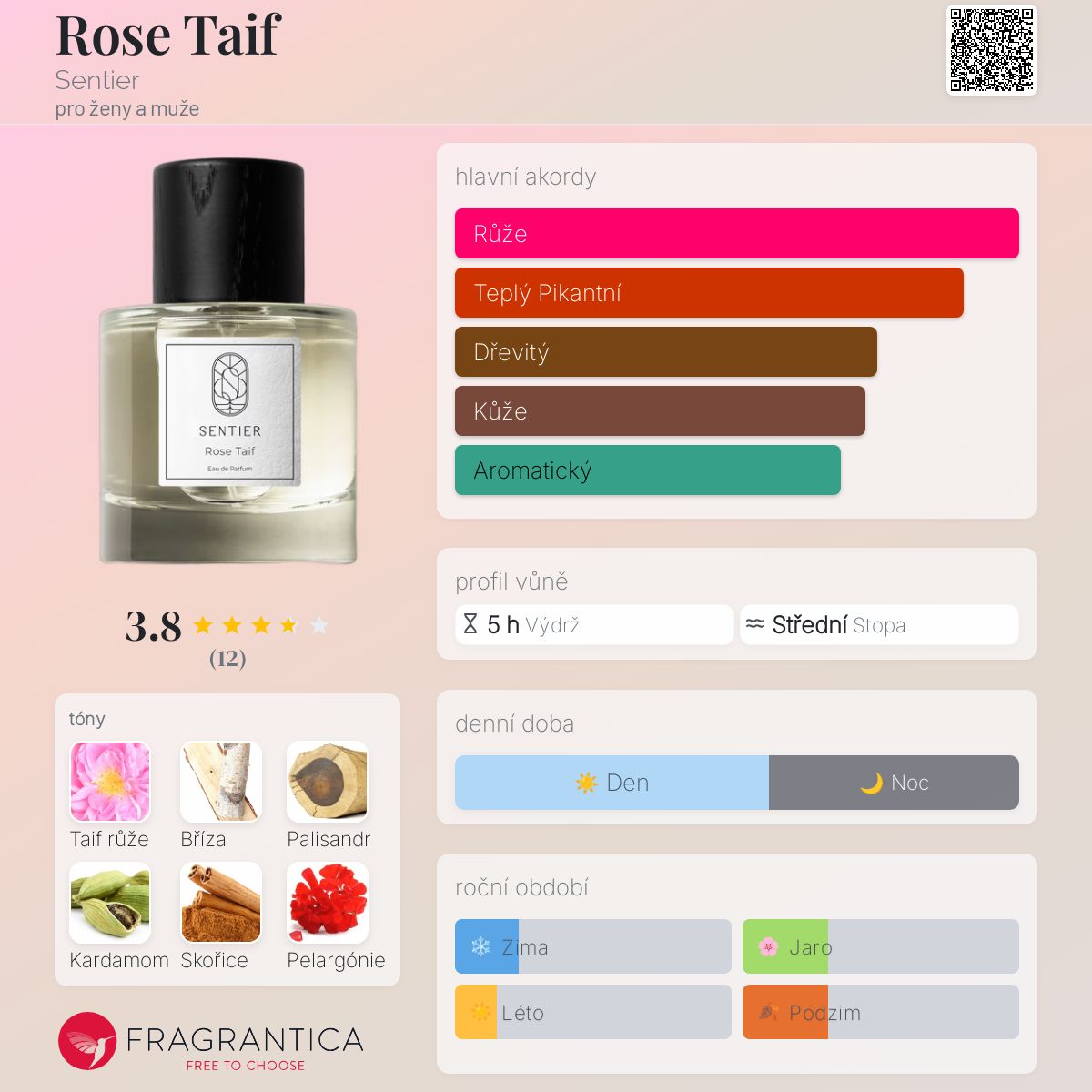 Rose Taif podle Sentier je Woody Floral Musk vůně pro ženy a muže. Toto je nová vůně. Rose Taif byl/a uveden/a v roce 2024. Vrchní tóny jsou Kardamom a Skořice; střední tóny jsouTaif růže a Pelargónie ; základní tóny jsou Bříza a Palisandr.