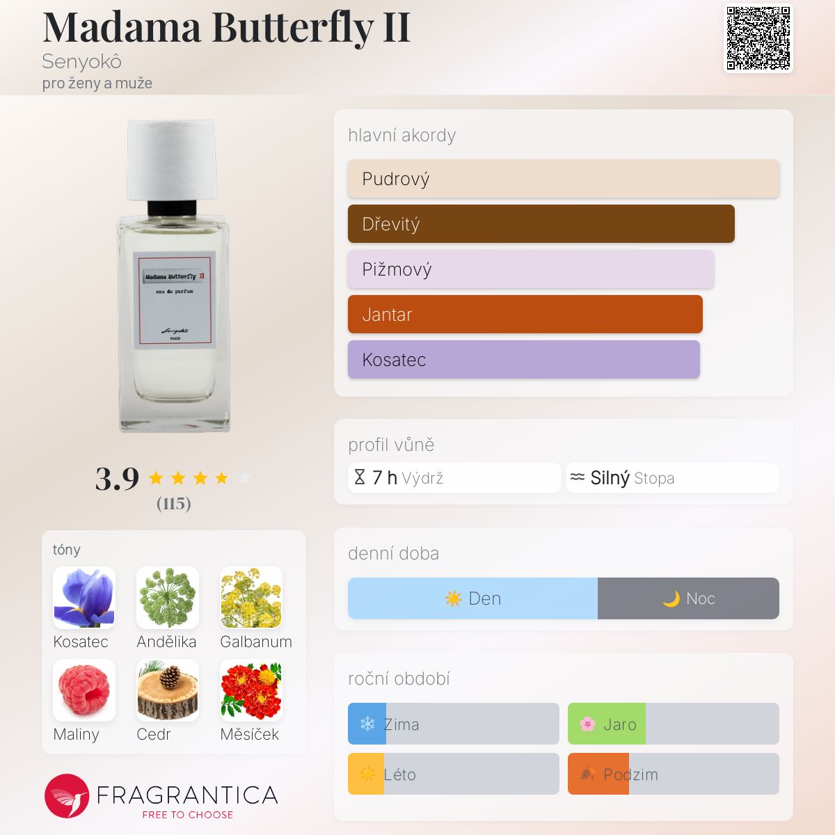Madama Butterfly II podle Senyokô je Floral Woody Musk vůně pro ženy a muže. Madama Butterfly II byl/a uveden/a v roce 2018. "Nosem" za touto vůní je Euan McCall. Vrchní tóny jsou Andělika, Aksamitník, Růžový pepř, Kdoule a Petitgrain; střední tóny jsouKosatec, Galbanum, Maliny, Kadidlo, Tulipán a Japonský třešňový květ ; základní tóny jsou Cedr, Pižmo, Santalové dřevo, Pačuli, Ambra a Fazole tonka.