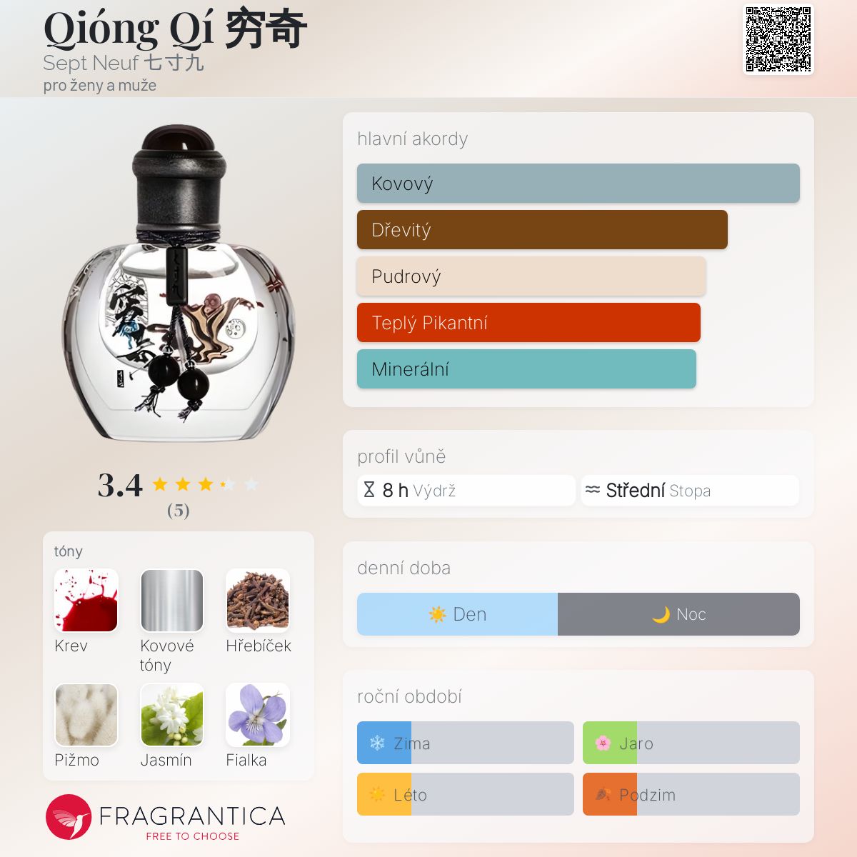 Qióng Qí 穷奇 podle Sept Neuf 七寸九 je vůně pro ženy a muže. Qióng Qí 穷奇 byl/a uveden/a v roce 2022. "Nosem" za touto vůní je Alexandra Carlin. Vrchní tóny jsou Krev, Kovové tóny a Hřebíček; střední tóny jsouBílé pižmo, Jasmín a Fialka ; základní tóny jsou Pačuli, Cedr a Jantar (ambra).