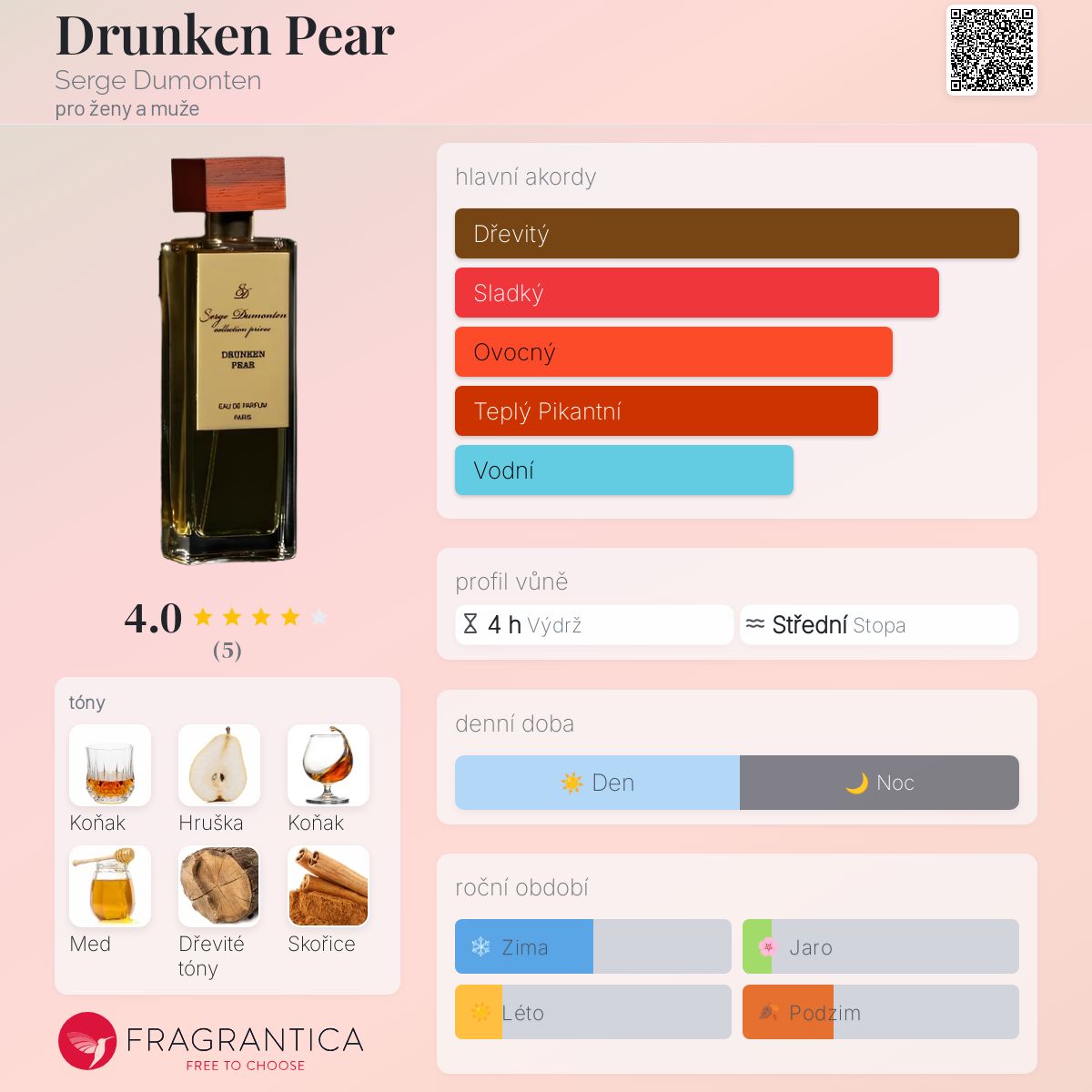 Drunken Pear podle Serge Dumonten je Orientální Vanilla vůně pro ženy a muže. Vrchní tóny jsou Brandy, Hruška a Med; střední tóny jsouDřevité tóny, Skořice a Vanilka ; základní tóny jsou Koňak a Ananas.