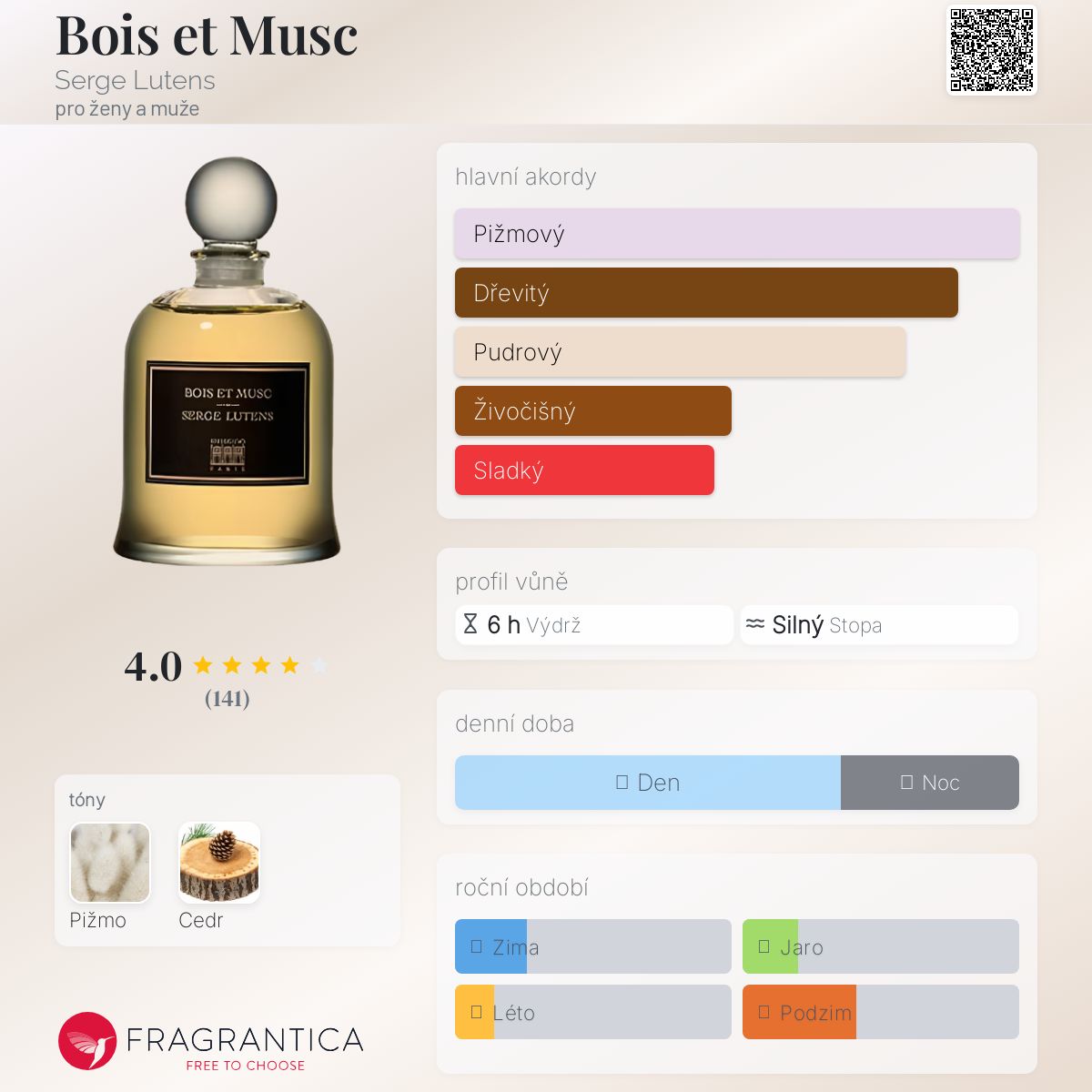 Bois et Musc podle Serge Lutens je Woody vůně pro ženy a muže. Bois et Musc byl/a uveden/a v roce 1992. "Nosem" za touto vůní je Christopher Sheldrake.