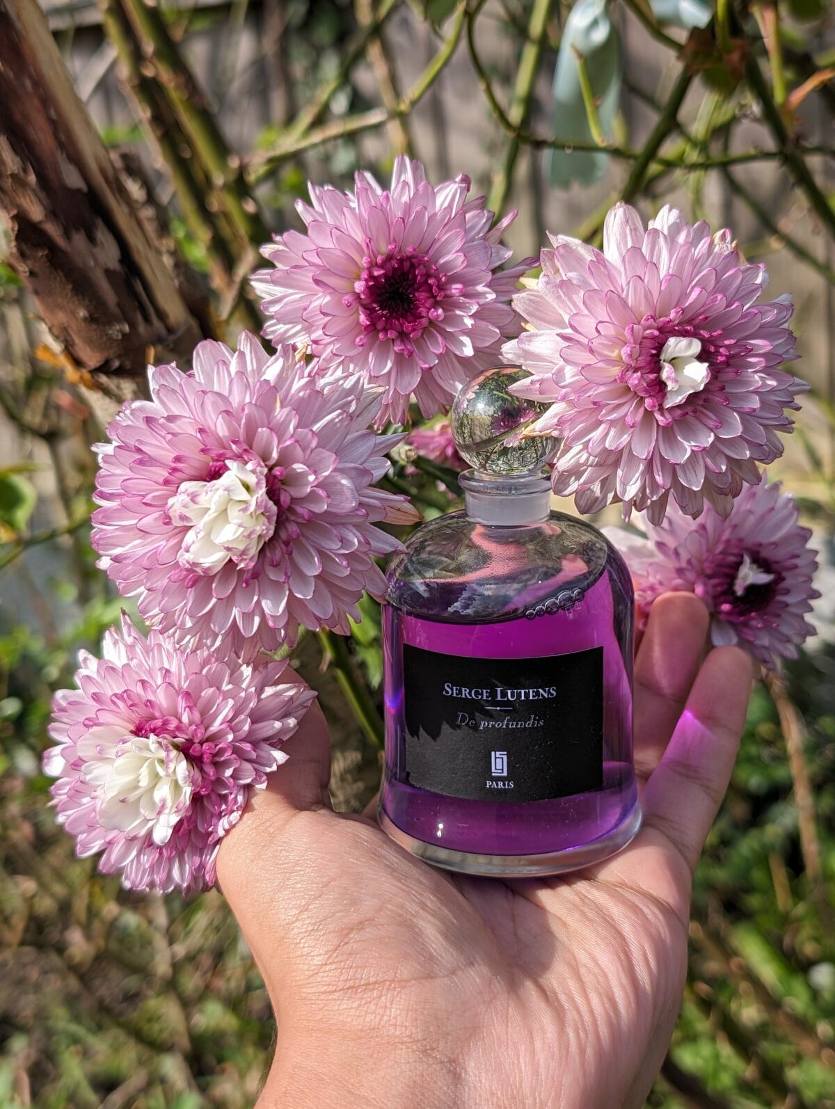 Chryzantéma je zvláštní nóta, která kromě své ucelenosti v koncepční linii Serge Lutense má také vůni podobnou ranní rose, konjugující takový popis fialkou, zelenými tóny a zemitou tinkturou; způsobuje, že De Profundis s lehkostí evokuje vůni květin v dešti (Někteří velmi přesně podotkli, že "voní jako mokrý hřbitov"). V recenzi, která mi předchází, se uvádí, že v sobě nese řadu jarních vůní; já si ji naopak jednoznačně spojuji s vůněmi zimními: večerní mlhy, ranní deště, vichřice, která smete listí listnatých stromů, listí poškozené deštěm, až se sjednotí se zemí, zvuk krupobití na okna jakéhokoli domu... De Profundis je krása a čistá melancholie (s atmosférou, která by se mohla směle rovnat L'Air du Temps od Niny Ricci).