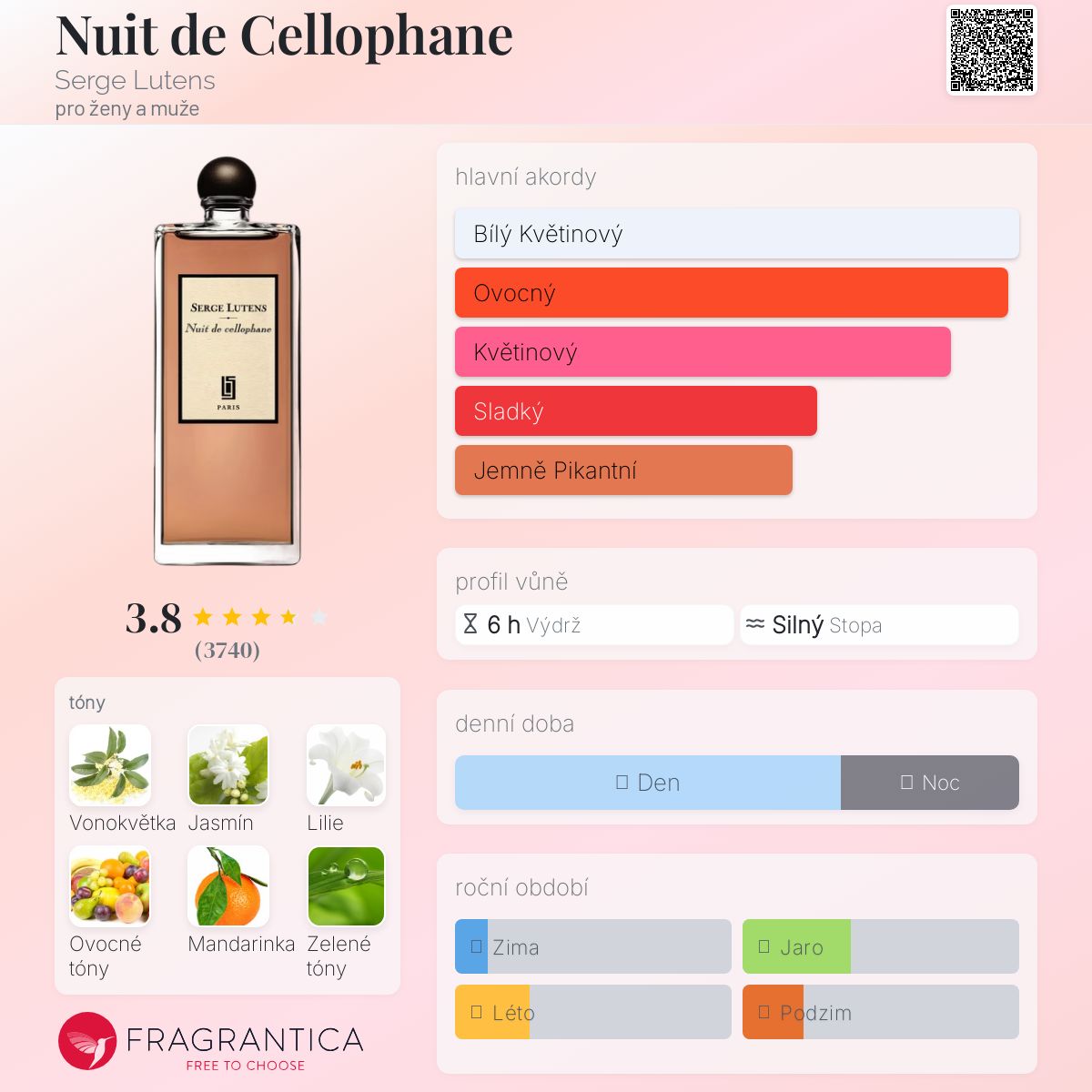 Nuit de Cellophane od Serge Lutens je úžasný parfém, který lze snadno sdílet a nosit při každé příležitosti. Je výrazný, elegantní, smyslný a nápadný.