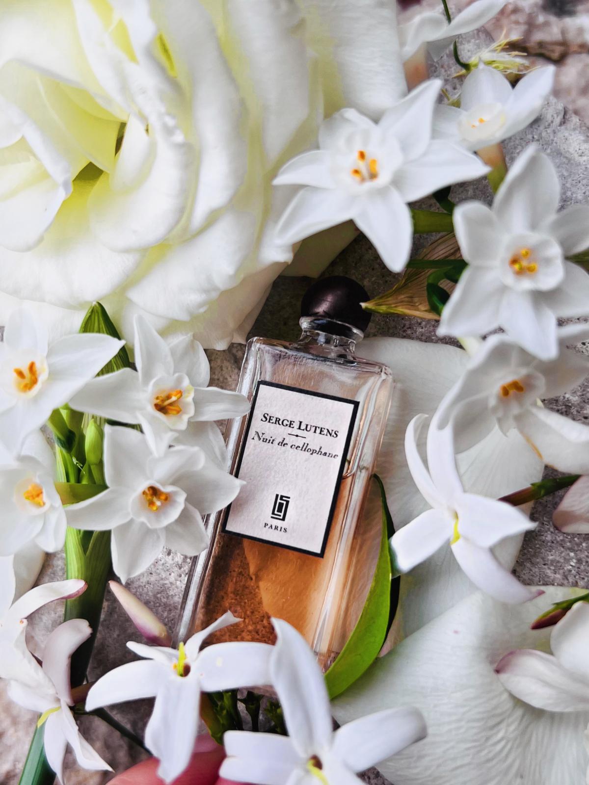 Bílé květy jako hlavní tón jsou typem parfému, který mám nejméně ráda (i když jim stále dávám přednost před "žádným" parfémem), jednak proto, že mě svědí nos, a jednak proto, že evokují typ ženskosti, který mi nevyhovuje (dávám přednost růži, která evokuje rovnováhu jin/jang). Ačkoli je Nuit de Cellophane intenzivní bílá květinová vůně, nezpůsobovala mi žádné svědění ani mě neobtěžovala svým ženštějším charakterem, což ji odlišuje od návrhářů stejného stylu a jaksi podprahově ospravedlňuje její označení "Serge Lutens", protože ačkoli v zásadě vypadá velmi podobně jako "obyčejný parfém", nese v sobě skryté nadstandardní kvality. Pokud mu chybí hutnost a krémovost, je to proto, že parfumér vědomě usiloval o vytvoření zářivého a vzdušného parfému, což se mu podařilo. Přesto zůstává mým nejméně oblíbeným stylem.