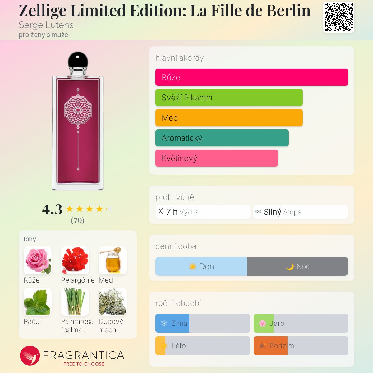 Zellige Limited Edition: La Fille de Berlin podle Serge Lutens je Orientální Floral vůně pro ženy a muže. Zellige Limited Edition: La Fille de Berlin byl/a uveden/a v roce 2020. "Nosem" za touto vůní je Christopher Sheldrake. Vrchní tóny jsou Růže a Pelargónie; střední tón jePalmarosa (palma růžová) ; základní tóny jsou Med, Pačuli a Mech.