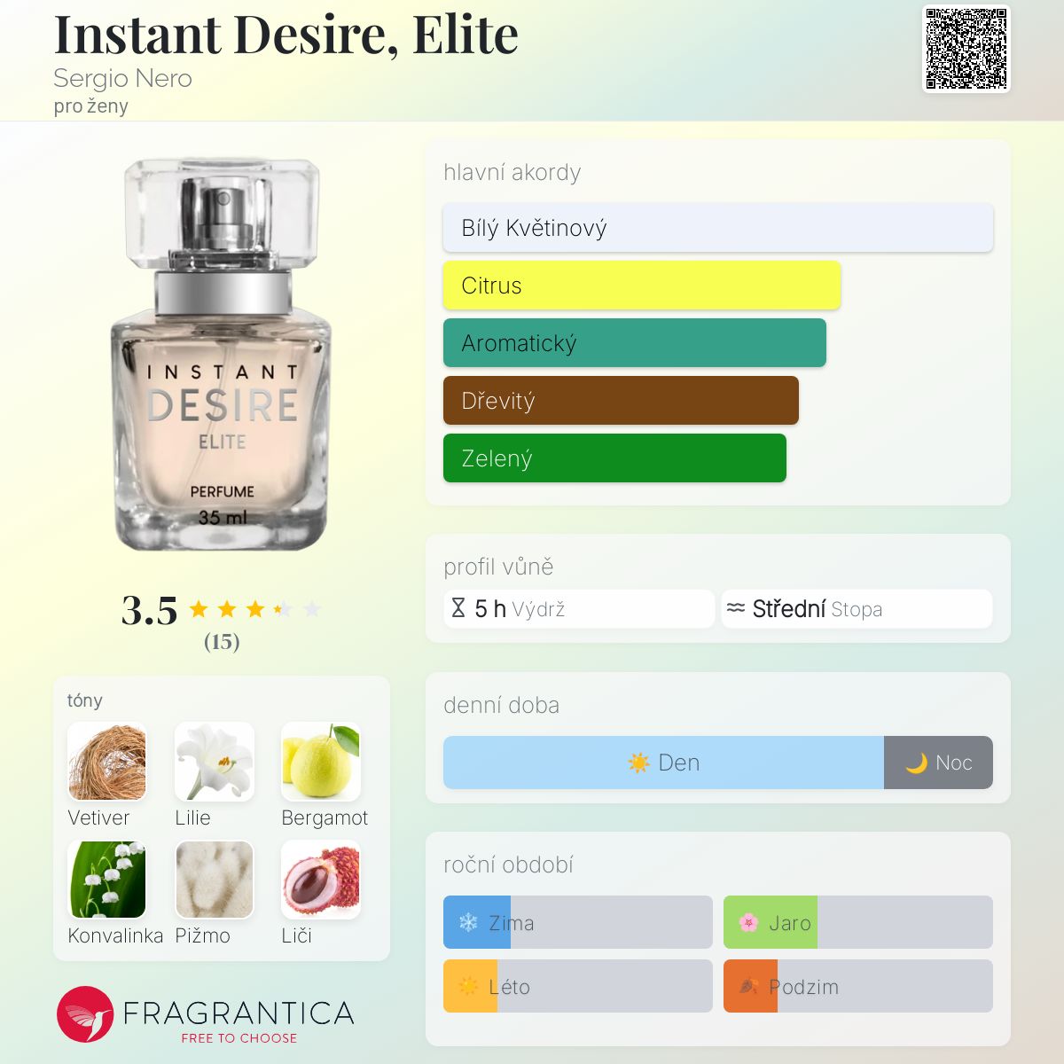 Instant Desire, Elite podle Sergio Nero je Floral Woody Musk vůně pro ženy. Instant Desire, Elite byl/a uveden/a v roce 2020. Vrchní tóny jsou Bergamot, Liči, Mandarinka a Broskev; střední tóny jsouBílá lilie, Konvalinka, Jasmín a Švestka ; základní tóny jsou Vetiver, Pižmo a Jantar (ambra).