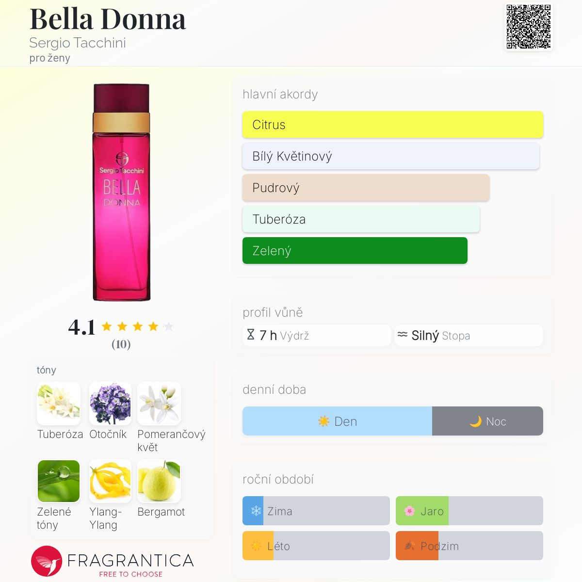 Bella Donna podle Sergio Tacchini je Floral vůně pro ženy. Toto je nová vůně. Bella Donna byl/a uveden/a v roce 2024. Vrchní tóny jsou Zelené tóny, Bergamot a Pomeranč; střední tóny jsouTuberóza, Otočník, Pomerančový květ a Ylang-Ylang ; základní tóny jsou Pižmo a Santalové dřevo.