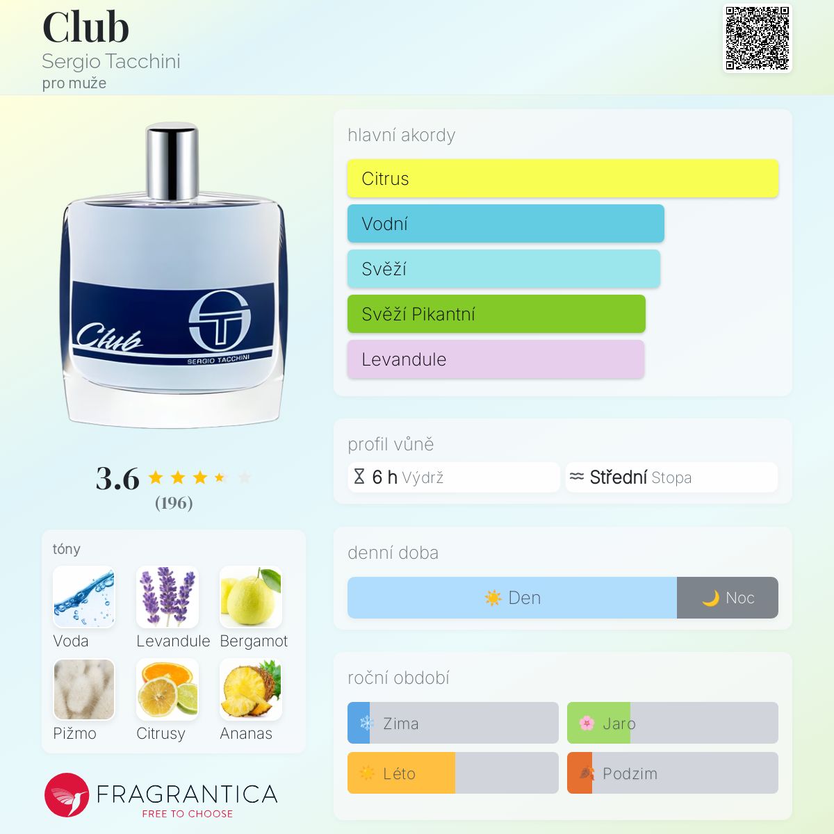 Club podle Sergio Tacchini je Aromatic Fougere vůně pro muže. Club byl/a uveden/a v roce 2012. "Nosem" za touto vůní je Symrise. Vrchní tóny jsou Bergamot, Citrusy a Yuzu; střední tóny jsouVodní tóny, Levandule a Ananas ; základní tóny jsou Pižmo, Dubový mech a Naplavené dříví.